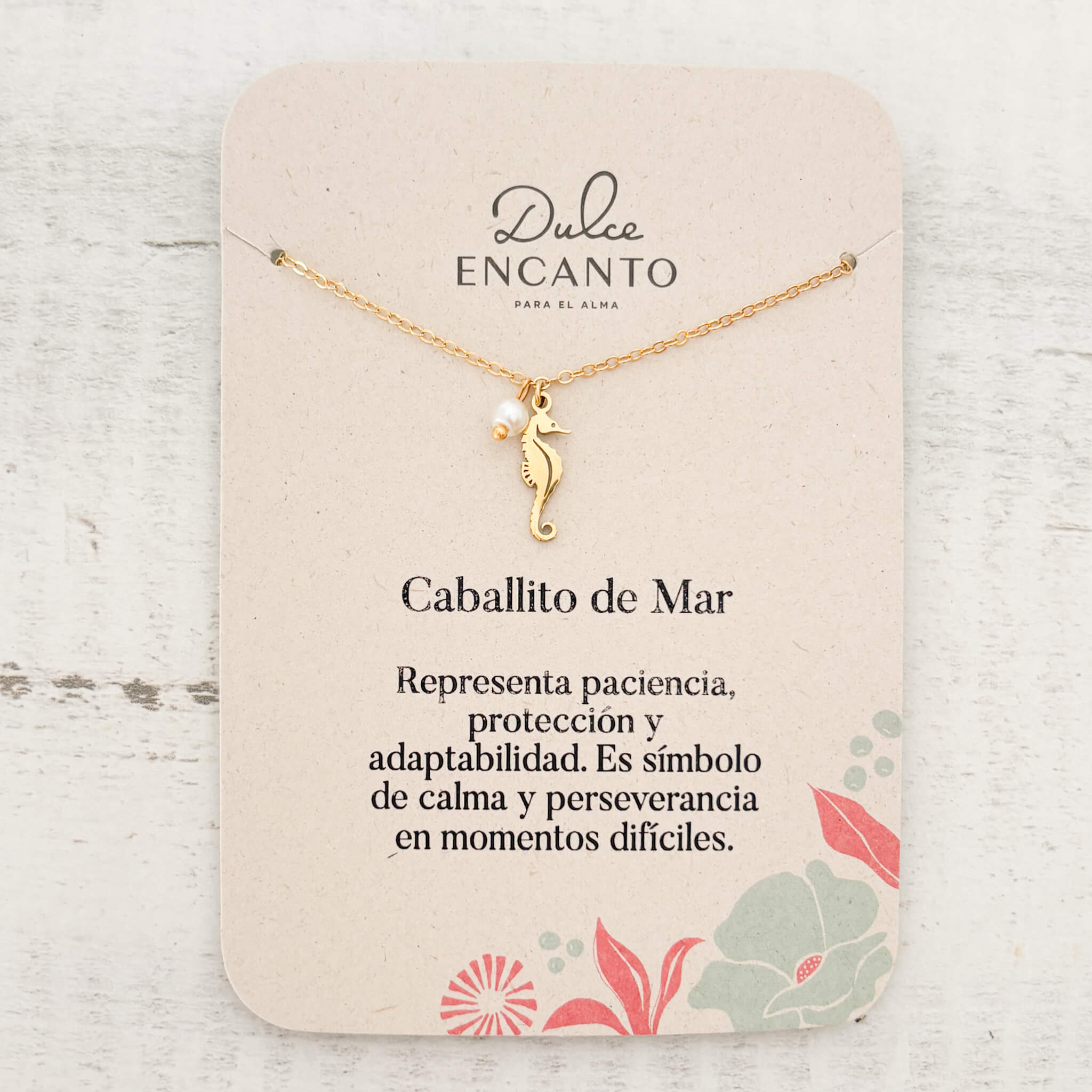 Cadena caballito de mar con mensaje para mujer. El dije caballito de mar representa paciencia, protección y adaptabilidad. Es símbolo de calma y perseverancia en momentos difíciles. Nuestras cadenas están llenas de significado y amor para inspirar y empoderar.