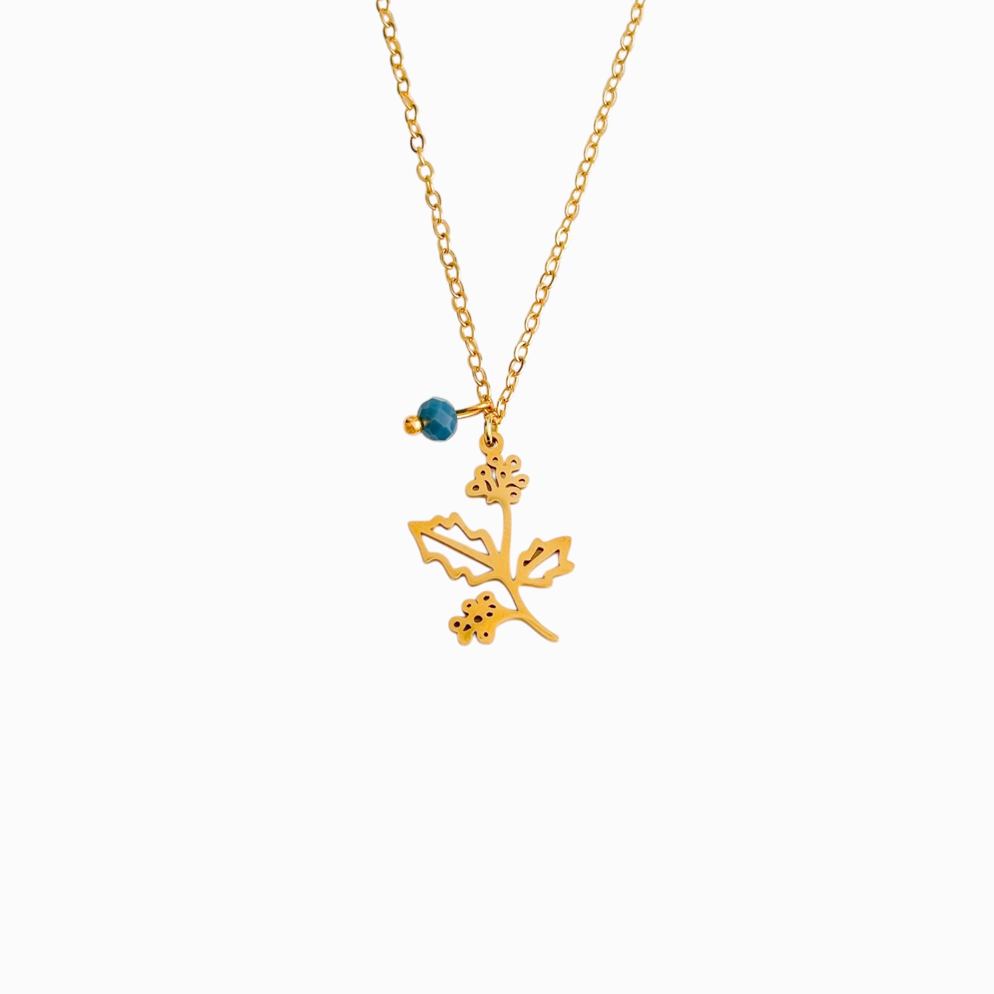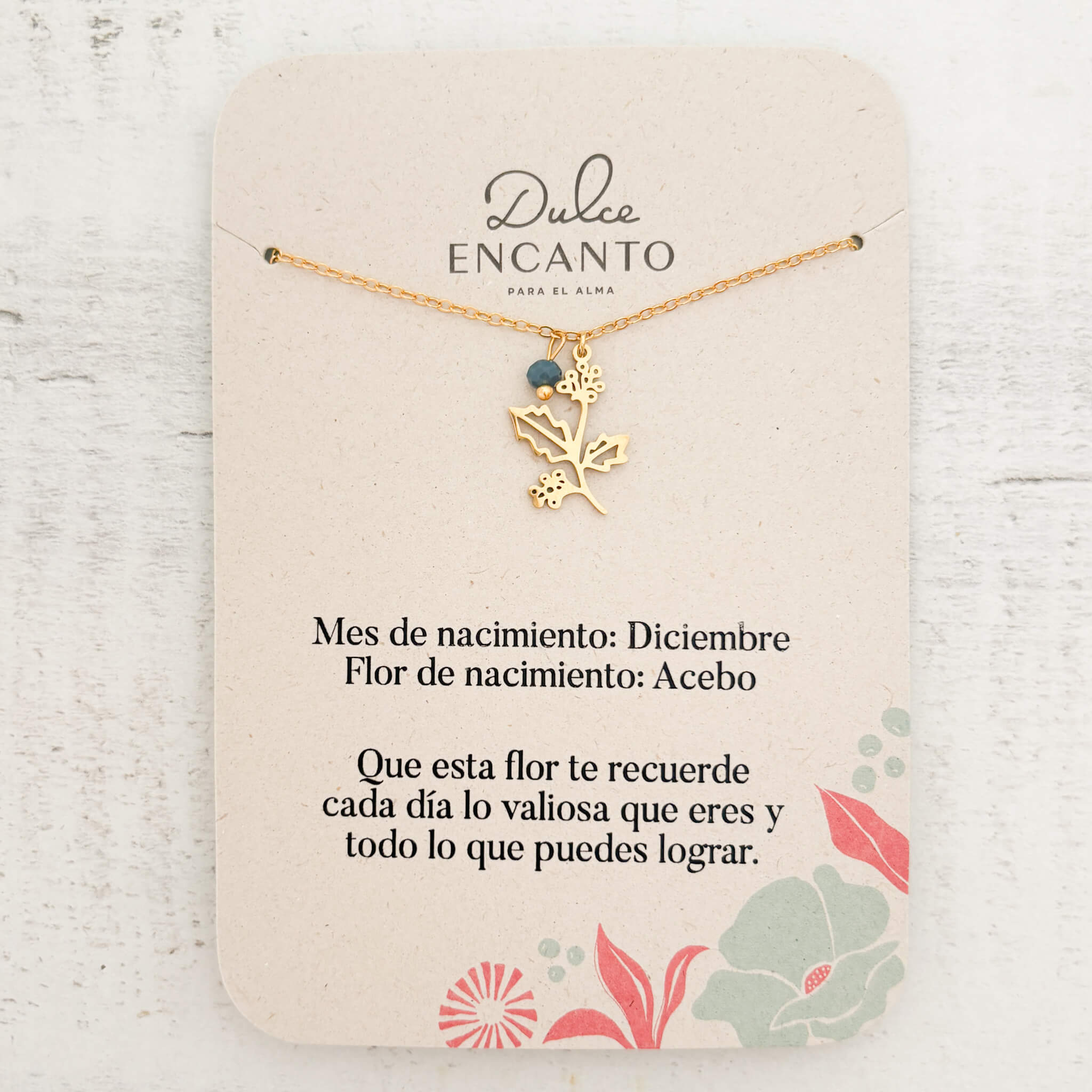 Cadena flor de nacimiento acebo mes de diciembre con mensaje para mujer. El dije de flor de acebo es símbolo de protección y fortaleza. Atrae buena suerte y simboliza fluidez en momentos de desafío. Nuestras cadenas están llenas de significado y amor para inspirar y empoderar.