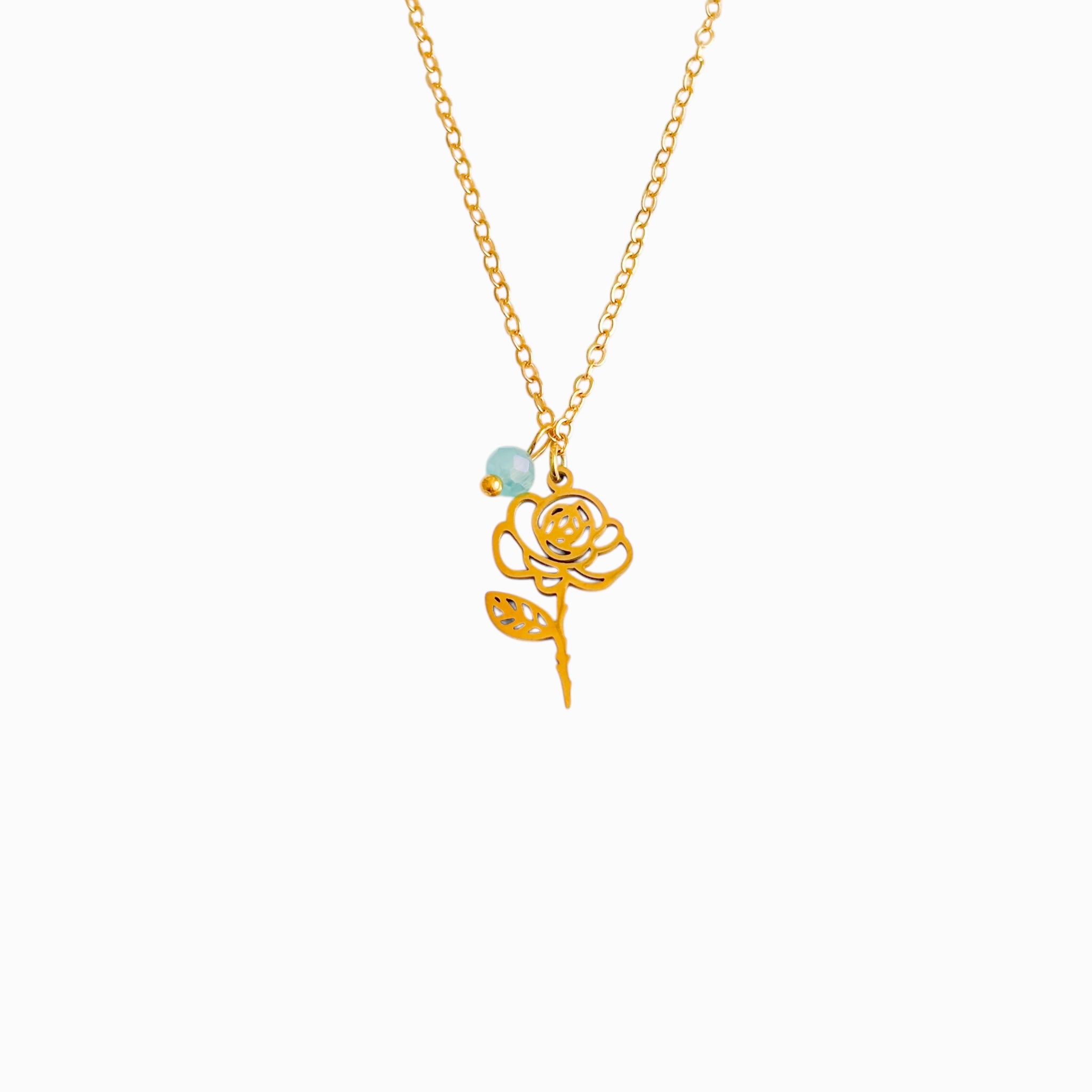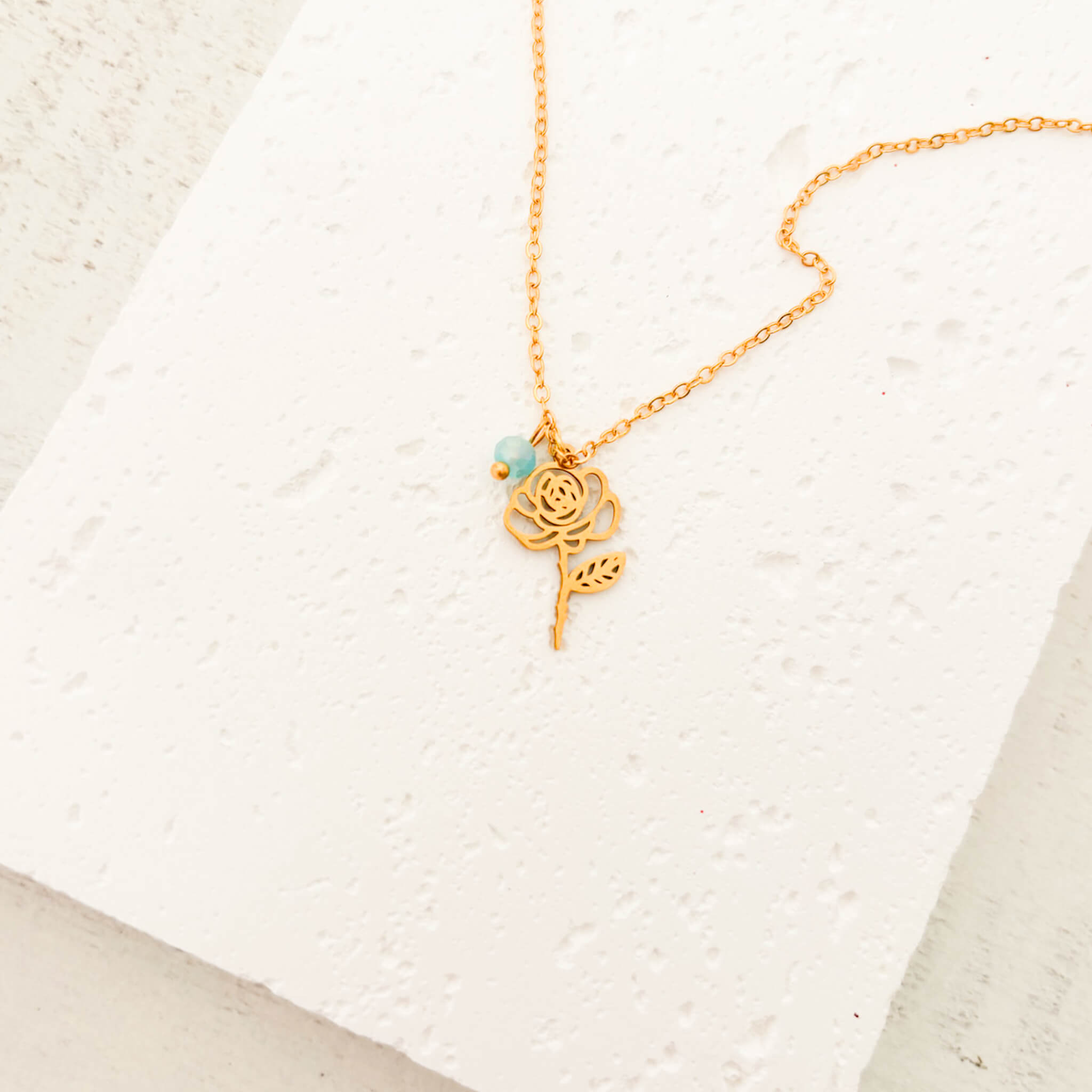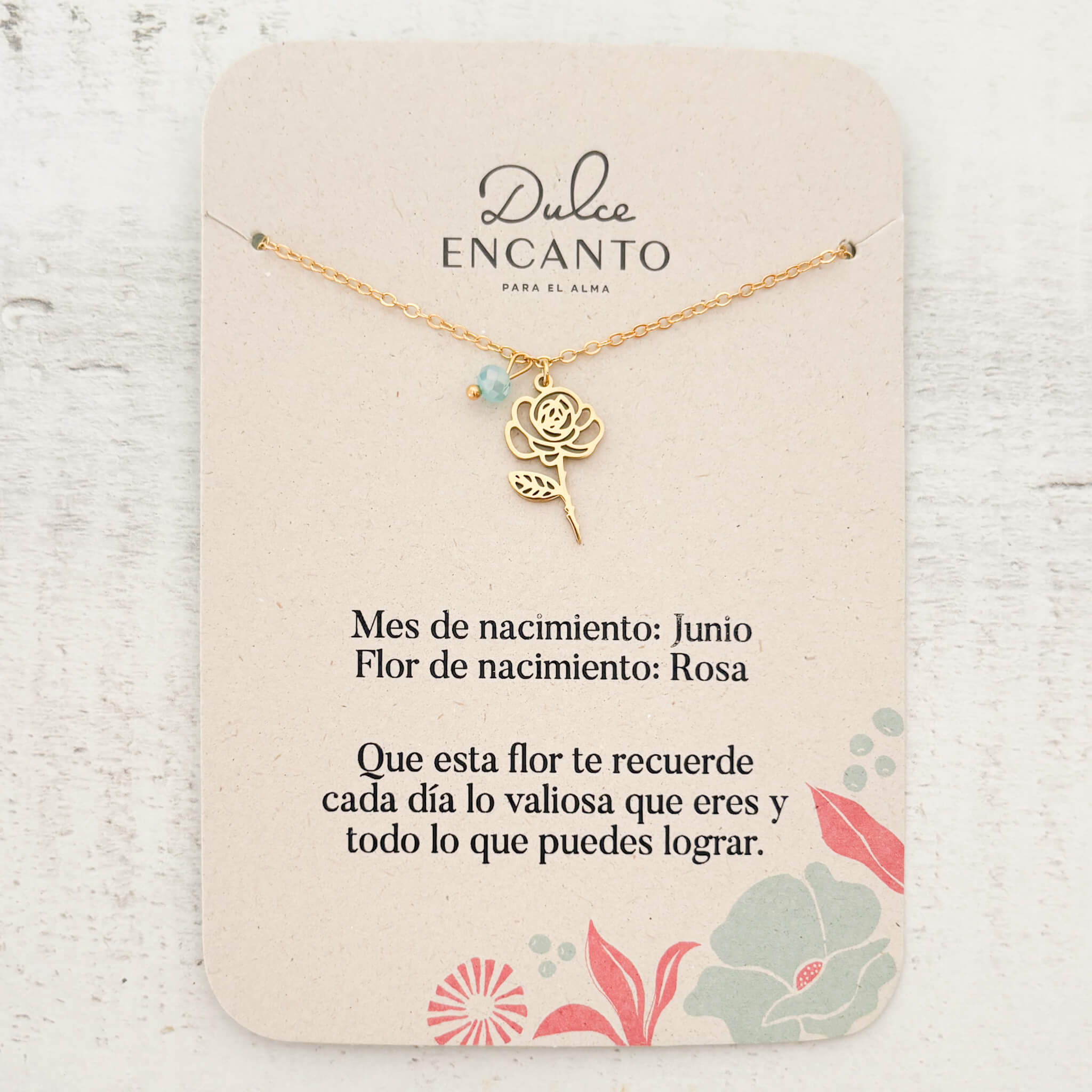 Cadena flor de nacimiento rosa mes de junio con mensaje para mujer. El dije de flor de rosa es símbolo de amor y pasión. Representa la belleza y afecto profundo. Nuestras cadenas están llenas de significado y amor para inspirar y empoderar.