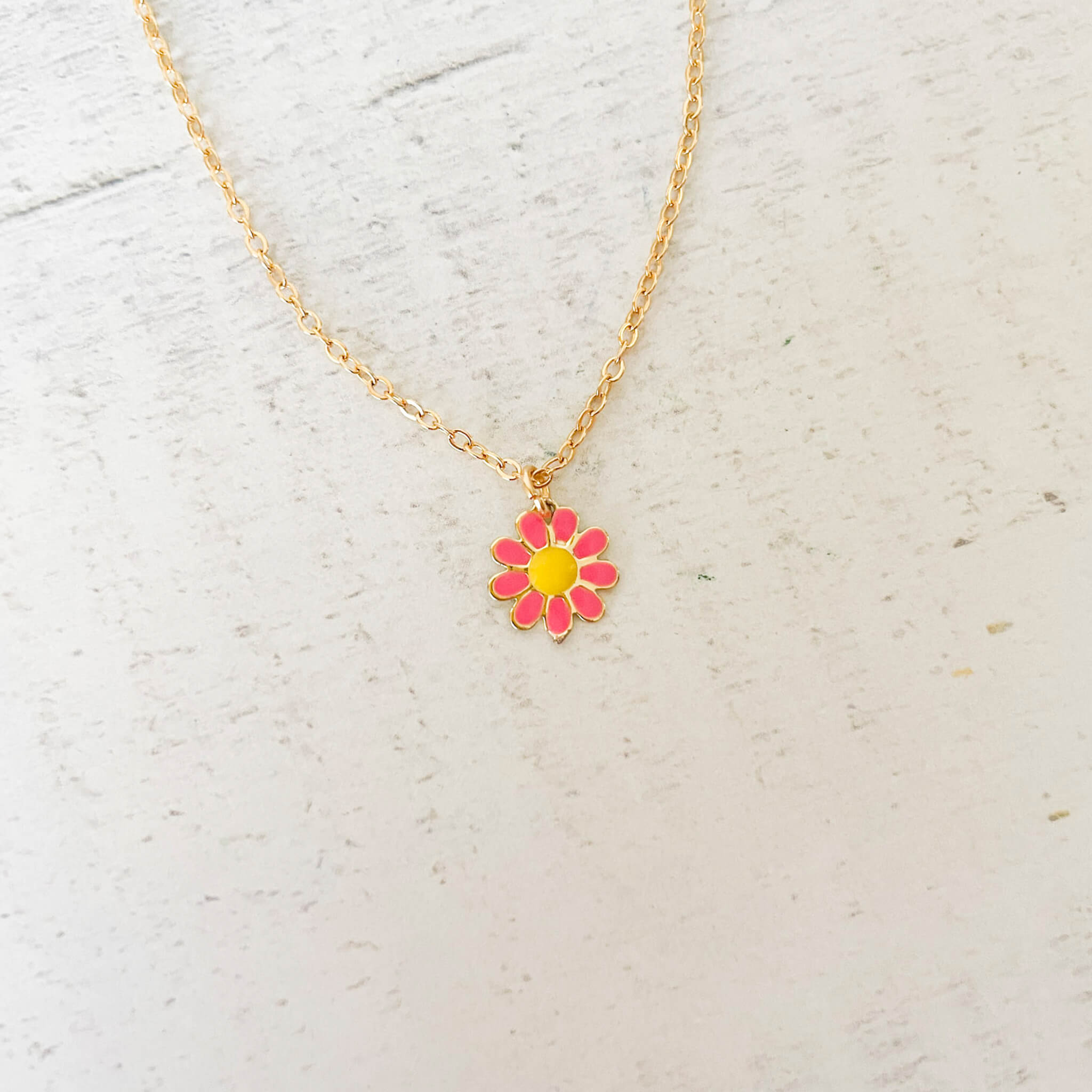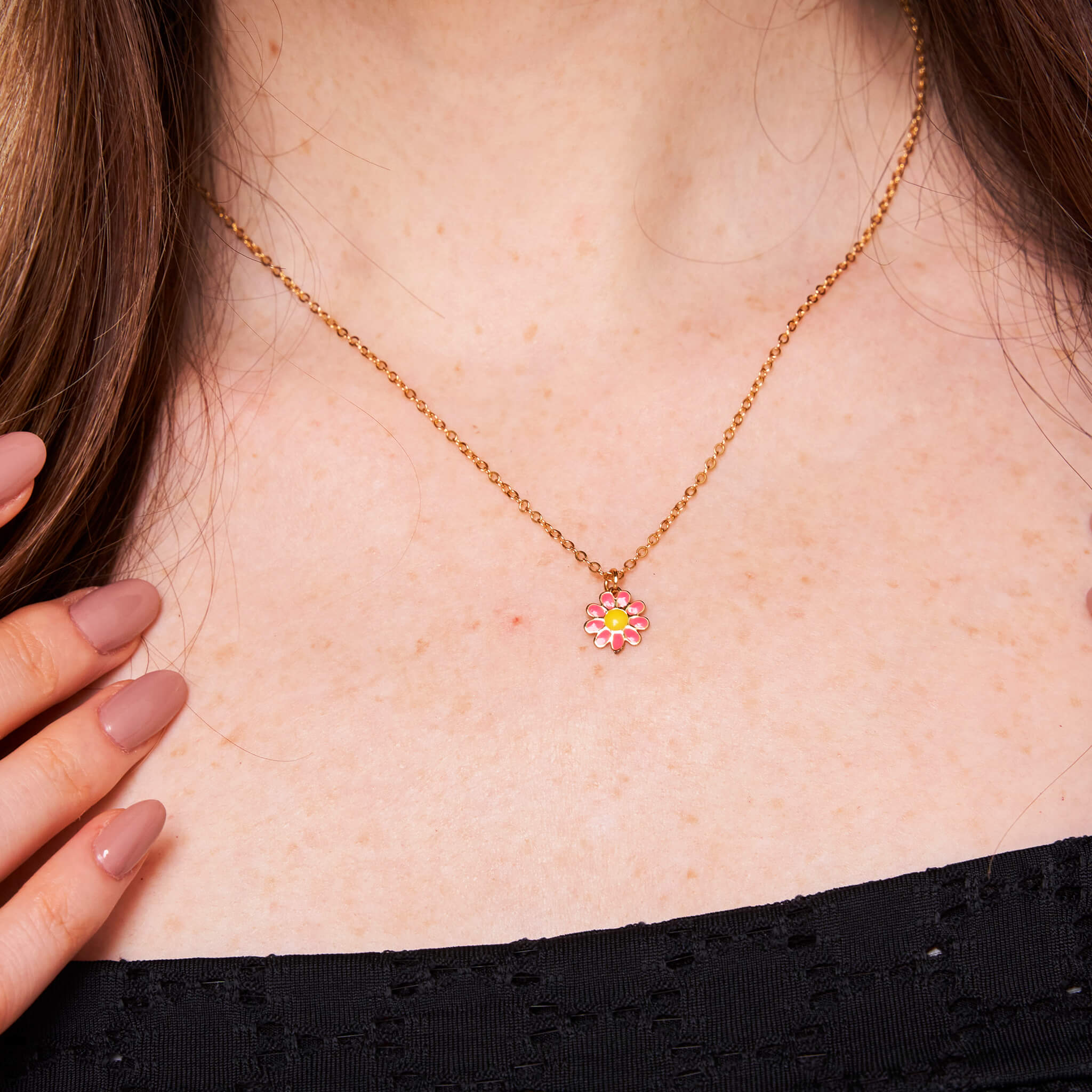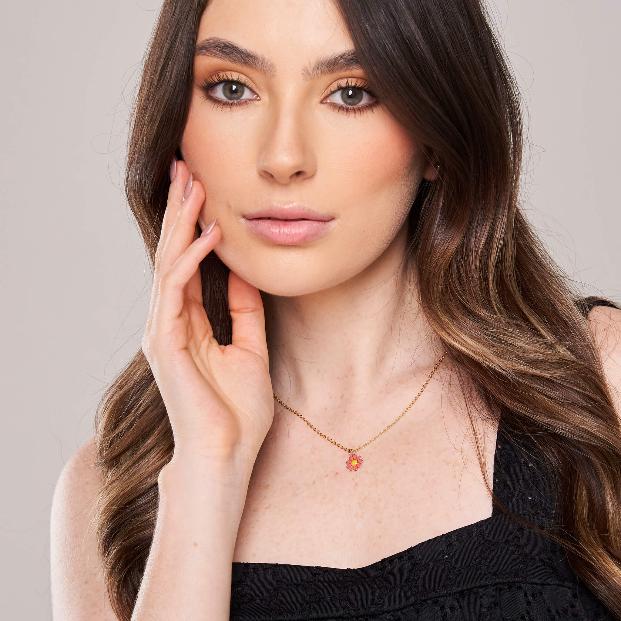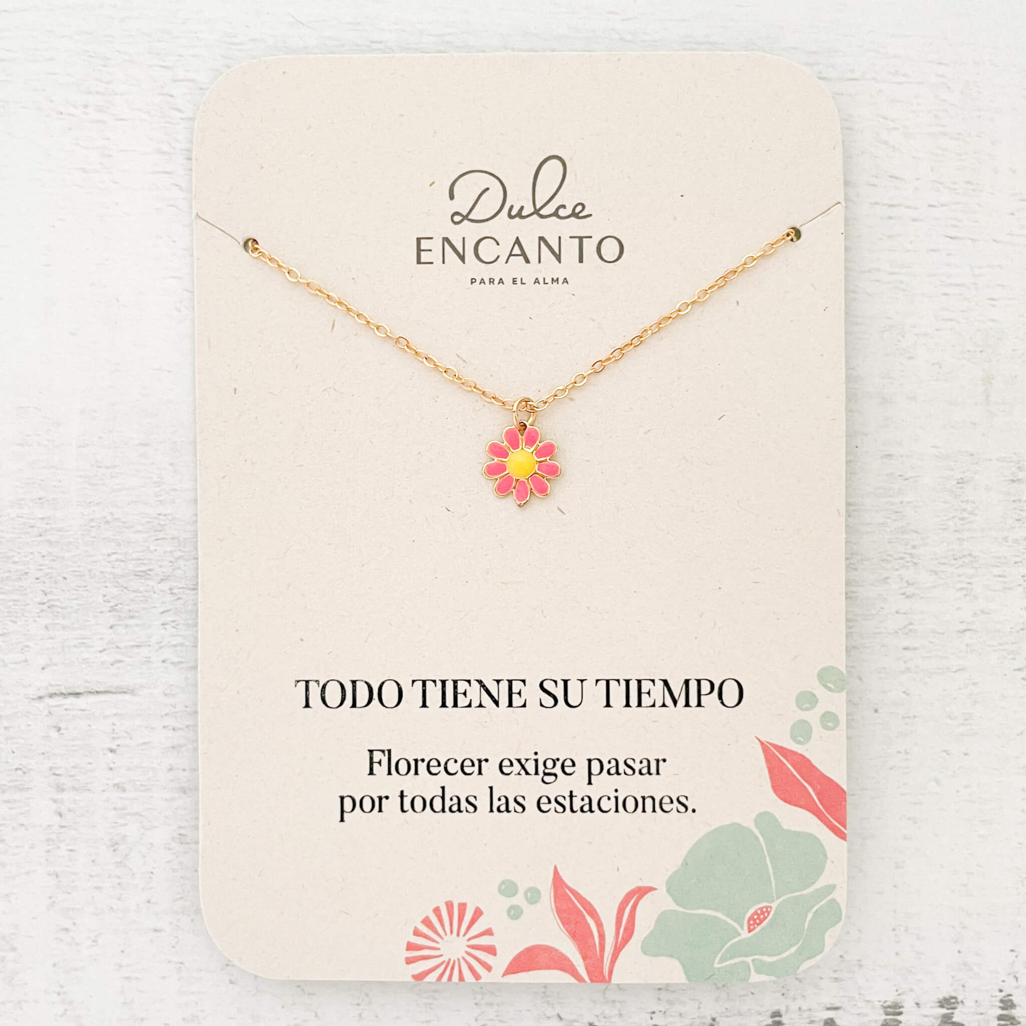 Cadena flor margarita magenta para mujer con mensaje, delicada y femenina elaborada a mano. El dije de flor margarita es símbolo de resiliencia. Nuestras cadenas están llenas de significado y amor para inspirar y empoderar.