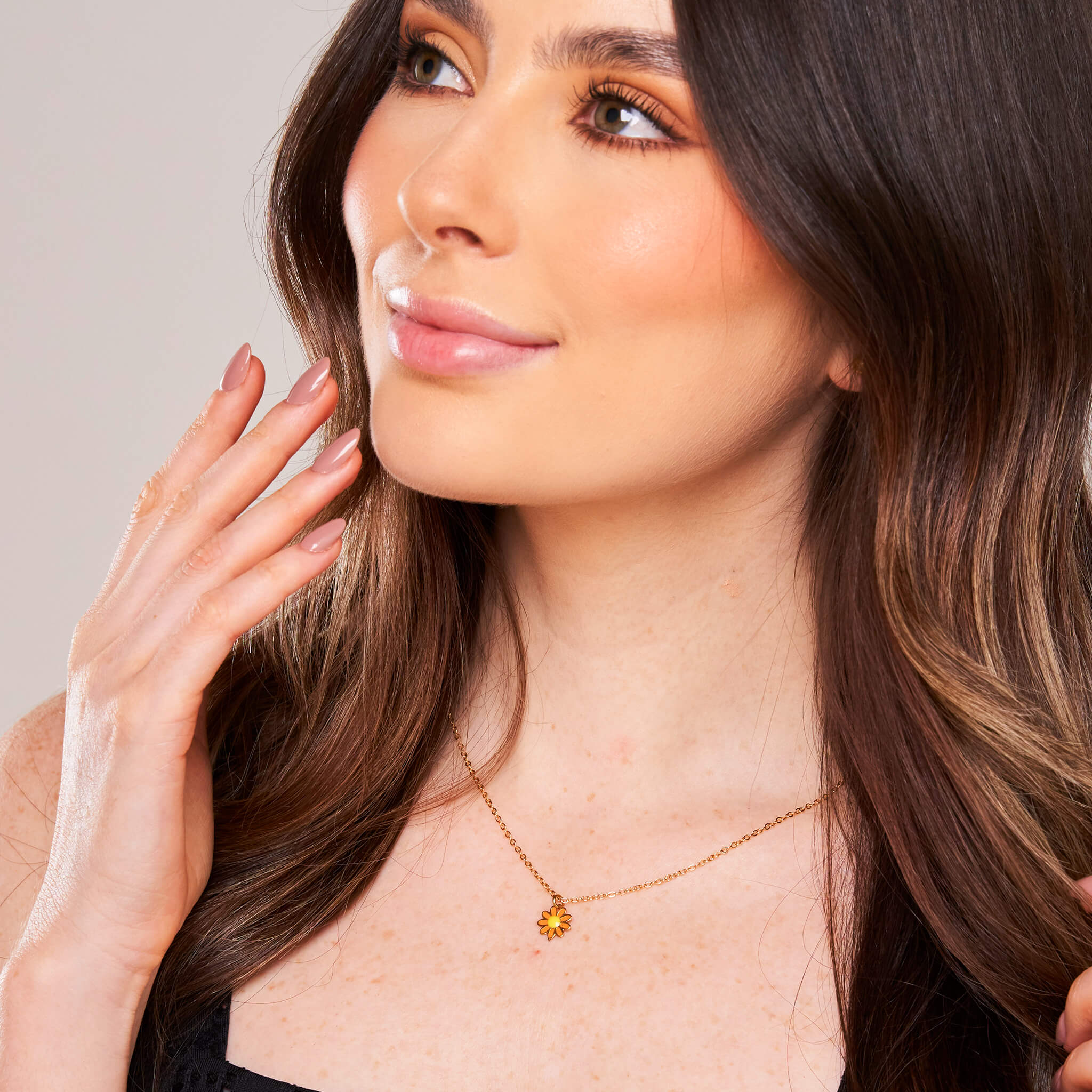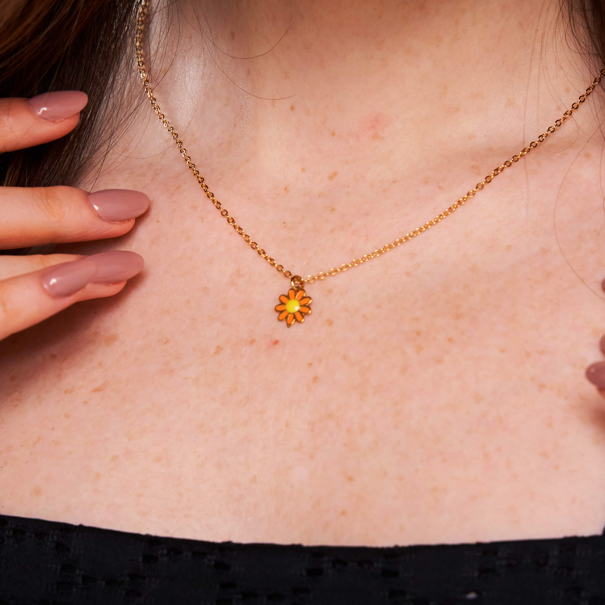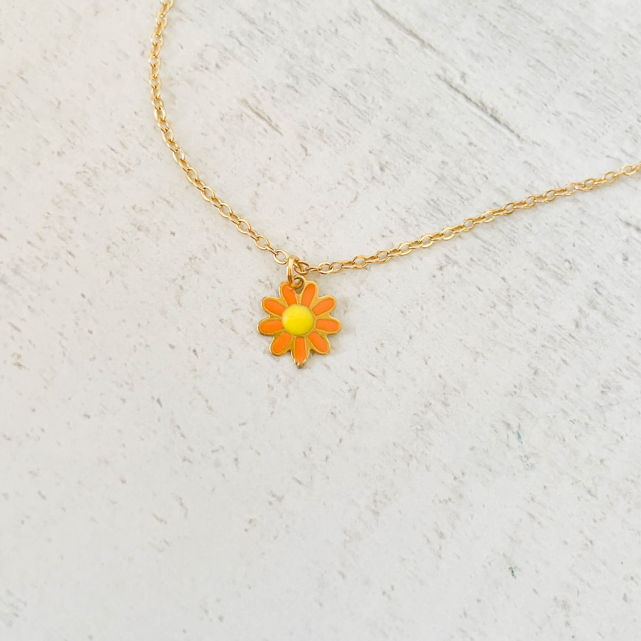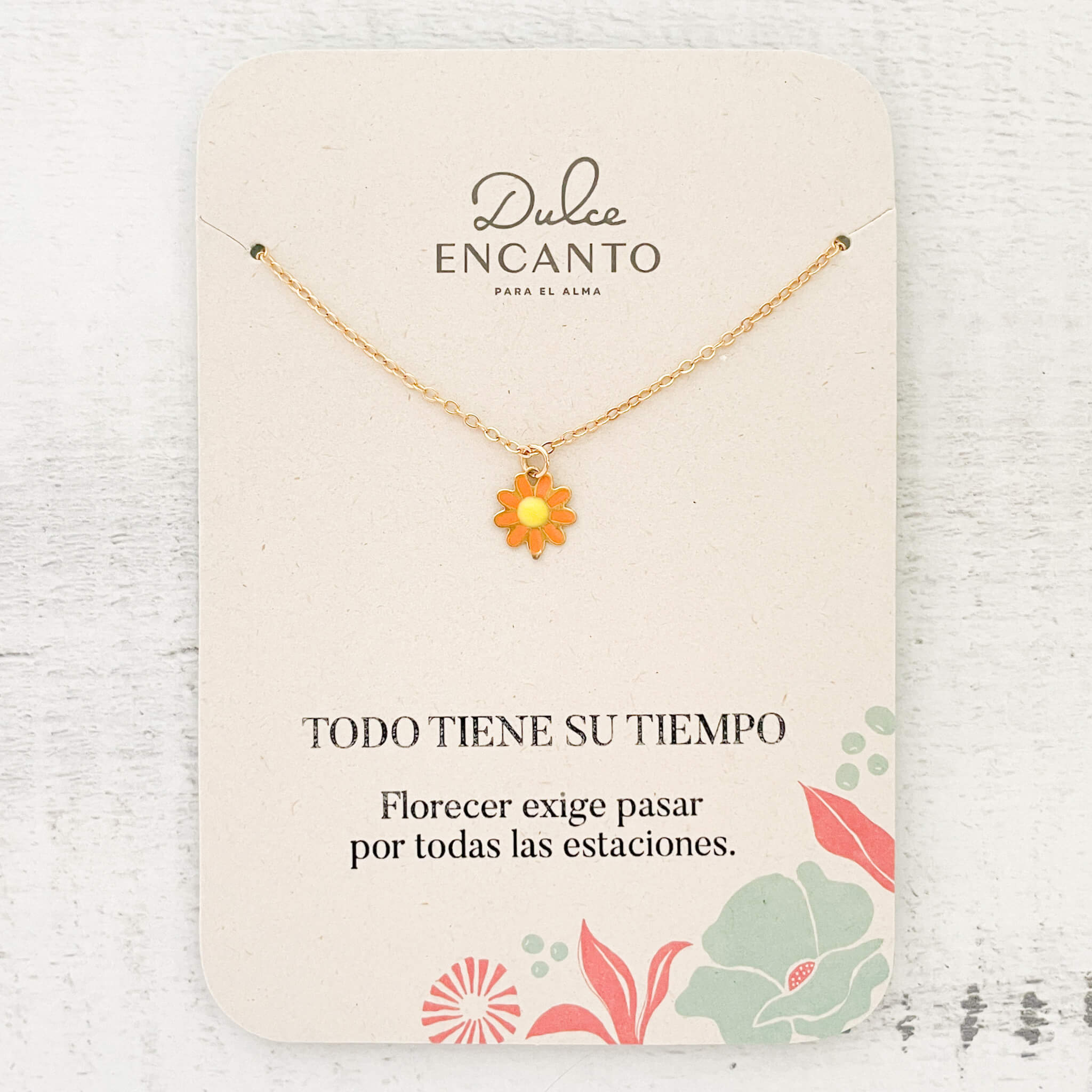 Cadena flor margarita naranjada para mujer con mensaje, delicada y femenina elaborada a mano. El dije de flor margarita es símbolo de resiliencia. Nuestras cadenas están llenas de significado y amor para inspirar y empoderar.