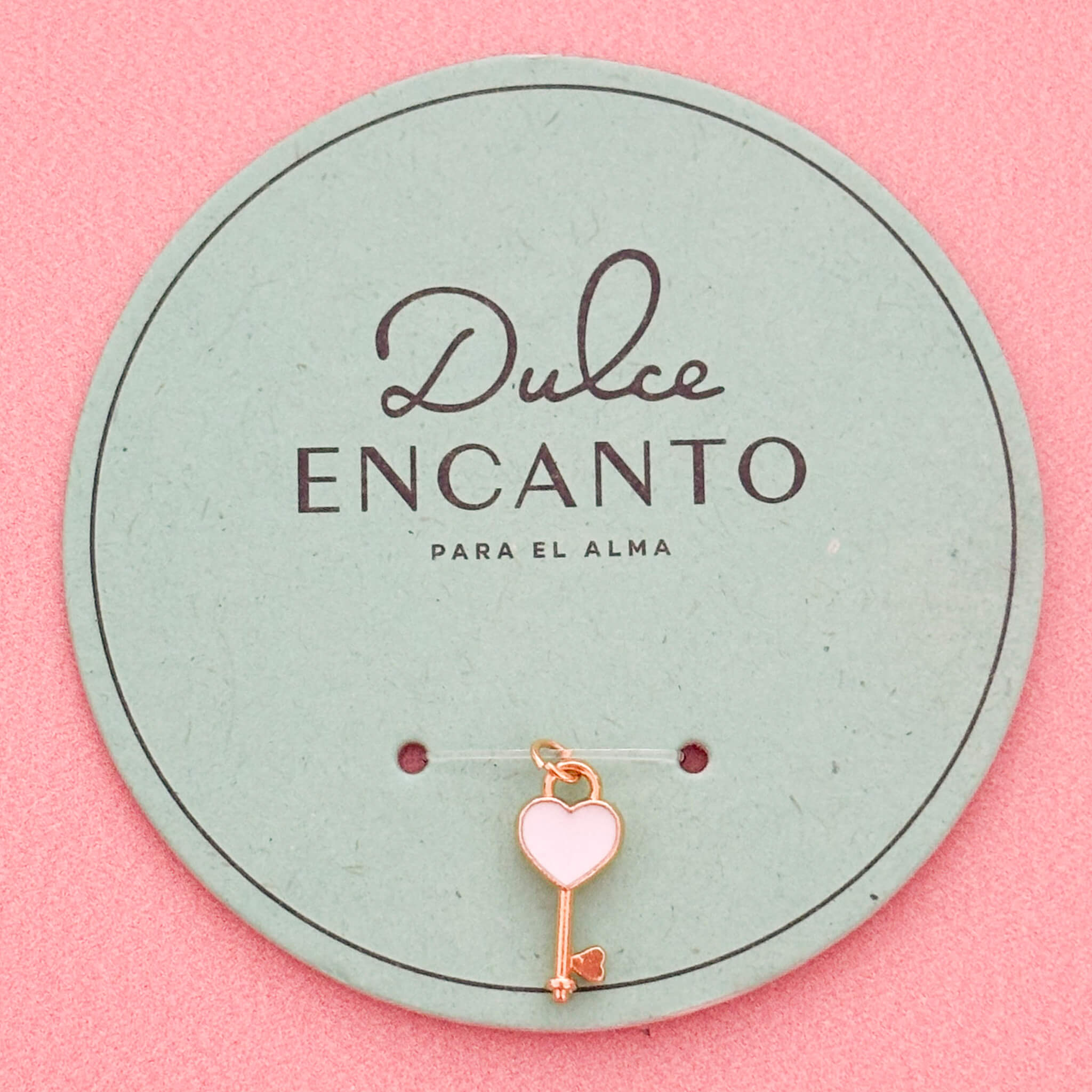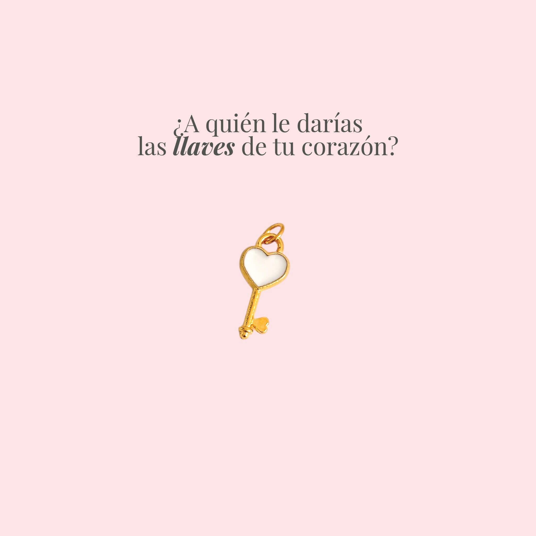Personaliza tu cadena con este dije de llave con corazón blanco. Pureza y amor eterno, un dije que simboliza la importancia de los lazos sinceros.