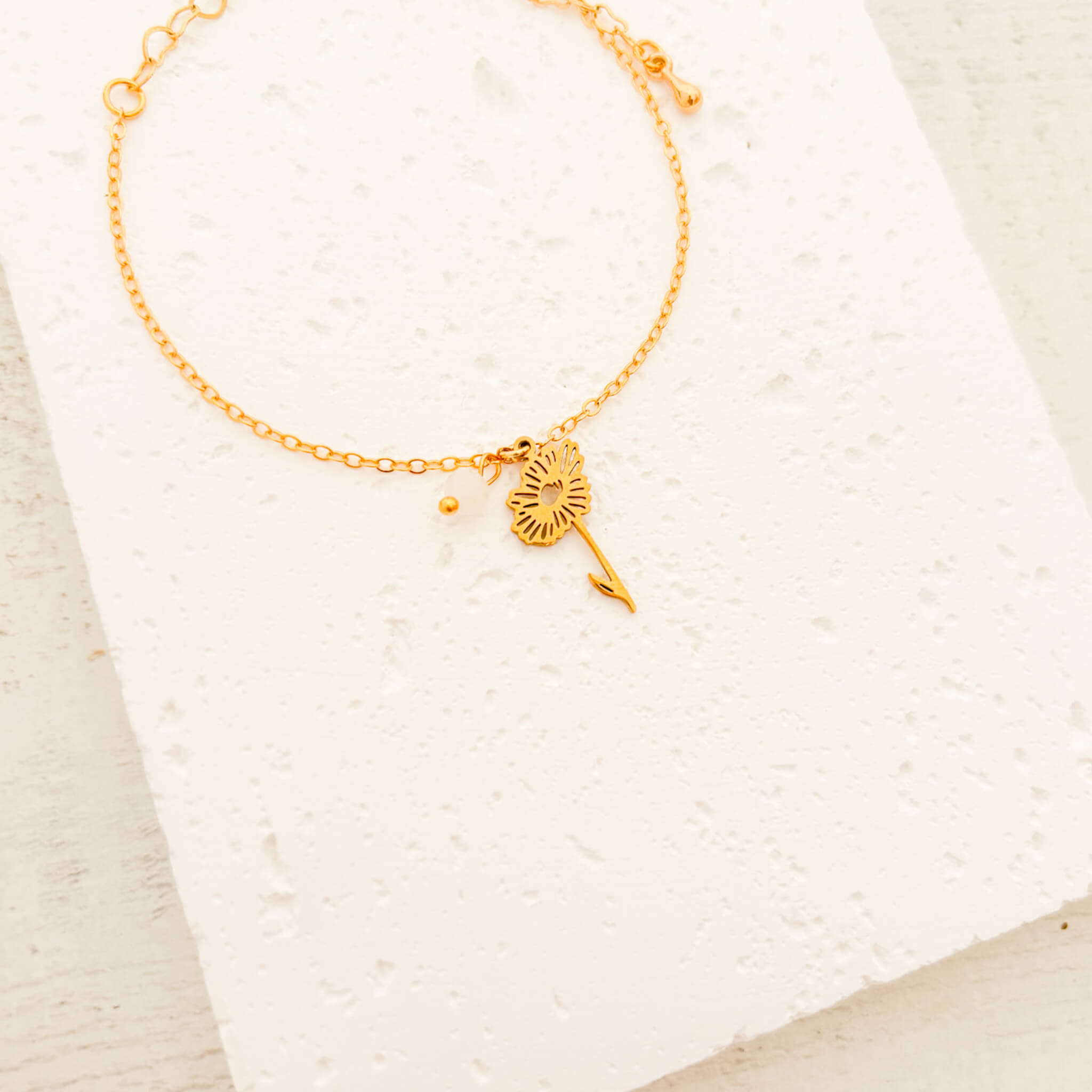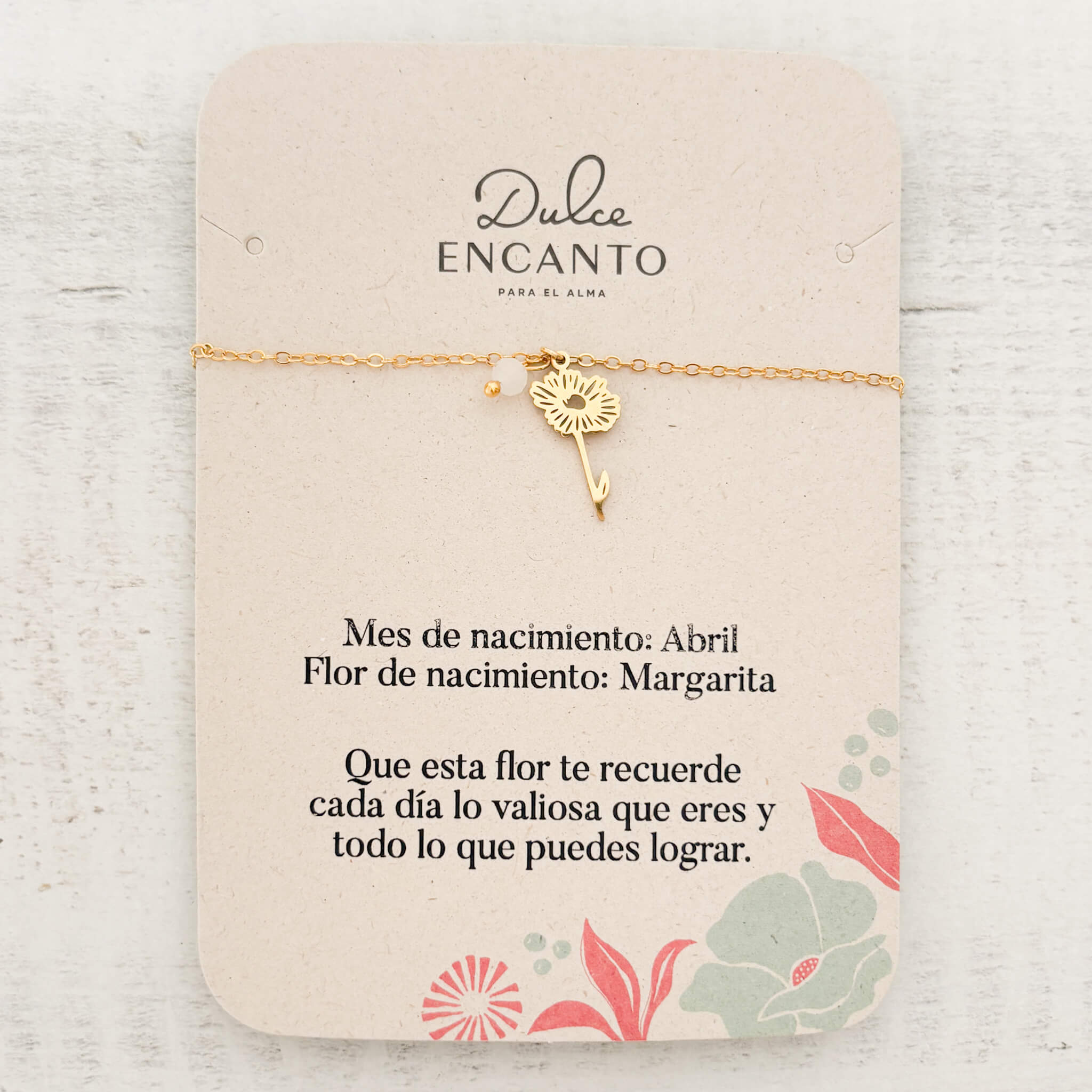 Pulsera flor de nacimiento margarita mes de abril con mensaje para mujer. El dije de flor de margarita es símbolo de alegría. Representa el amor leal y la belleza en la sencillez de las cosas. Nuestras pulseras están llenas de significado y amor para inspirar y empoderar.