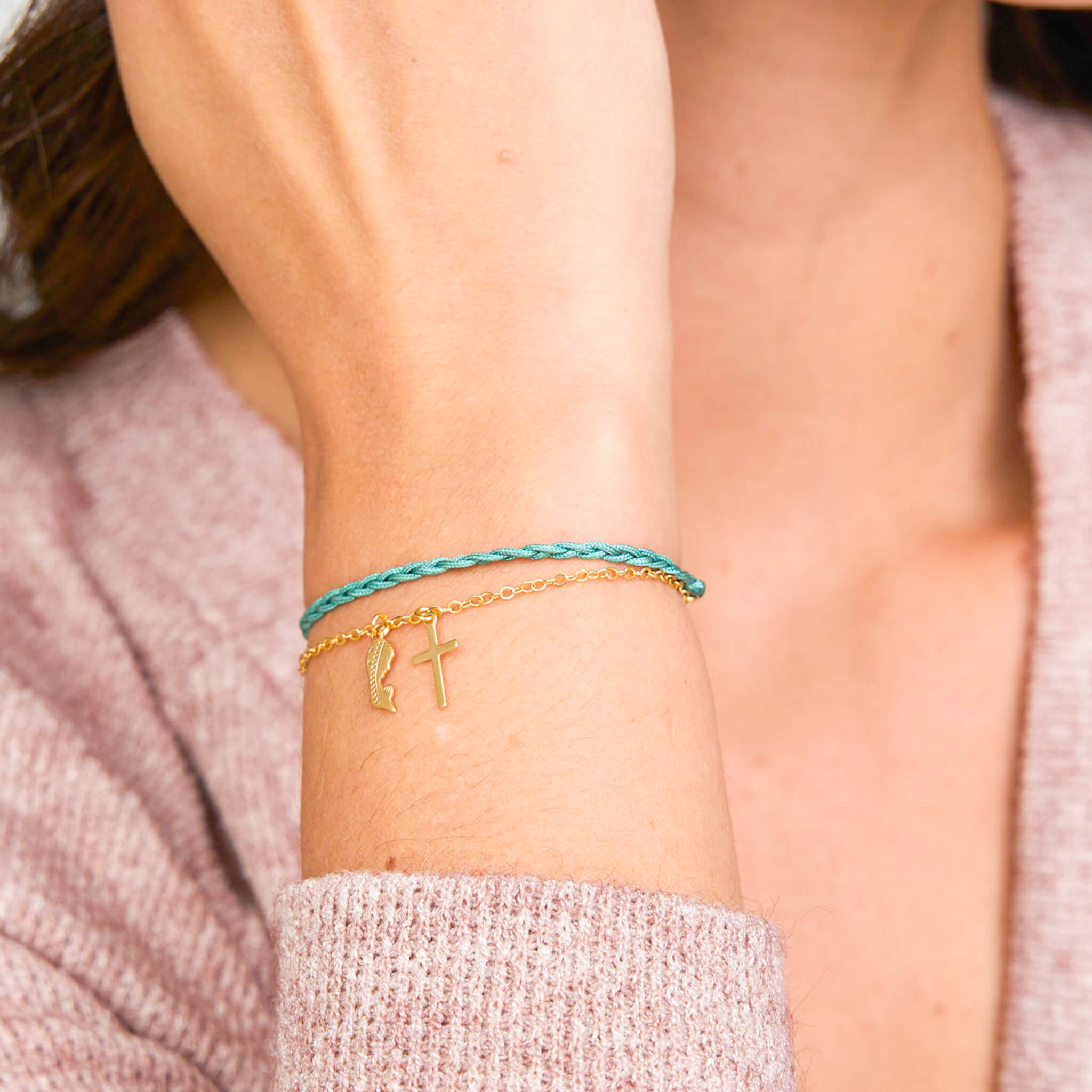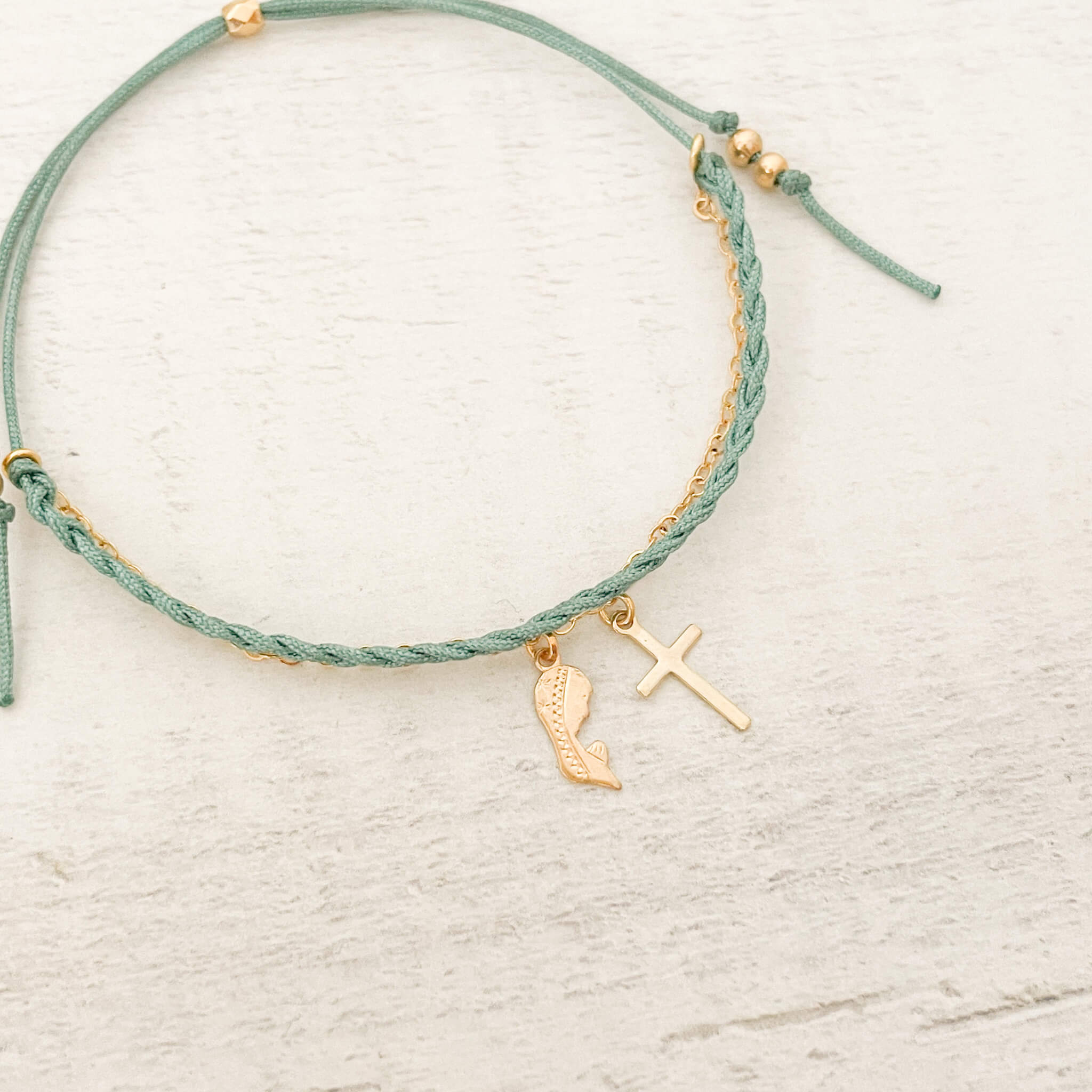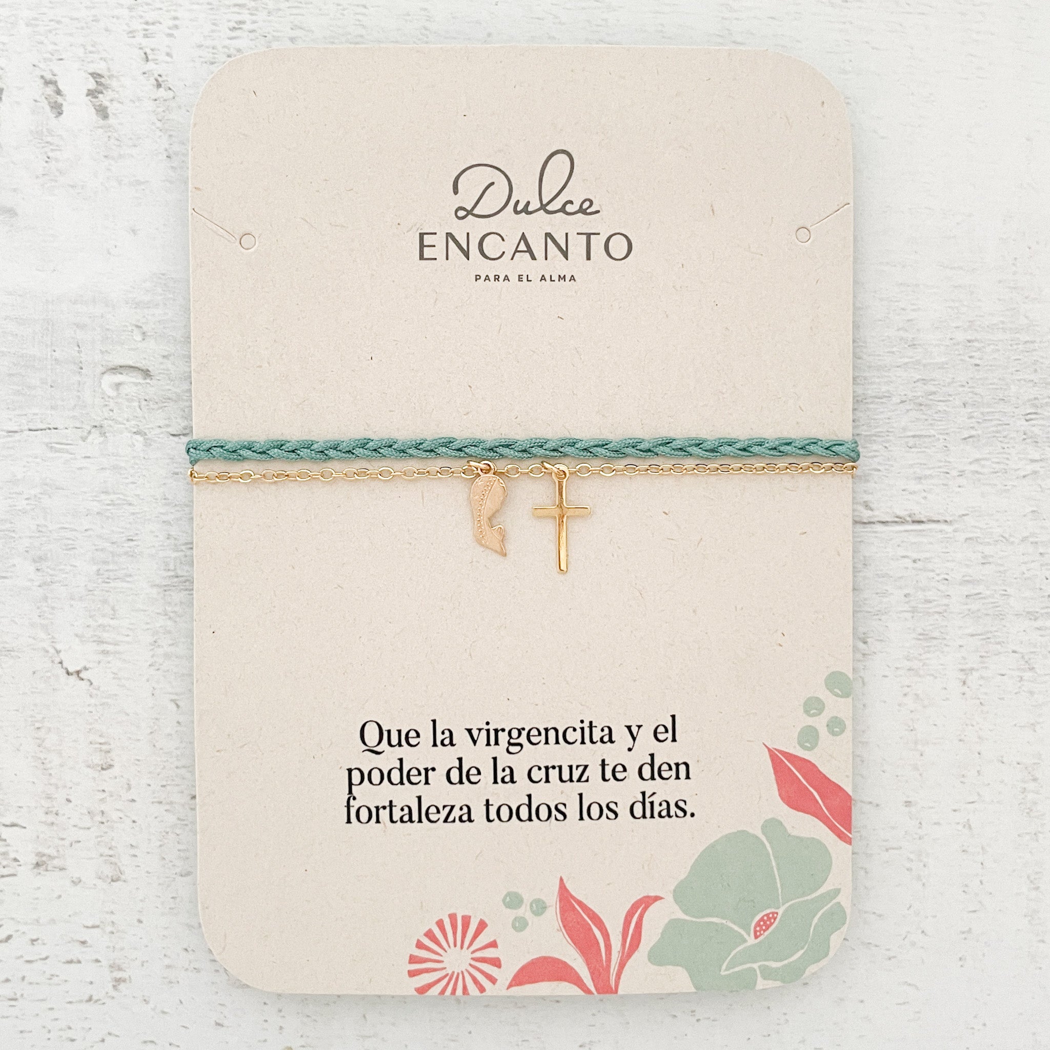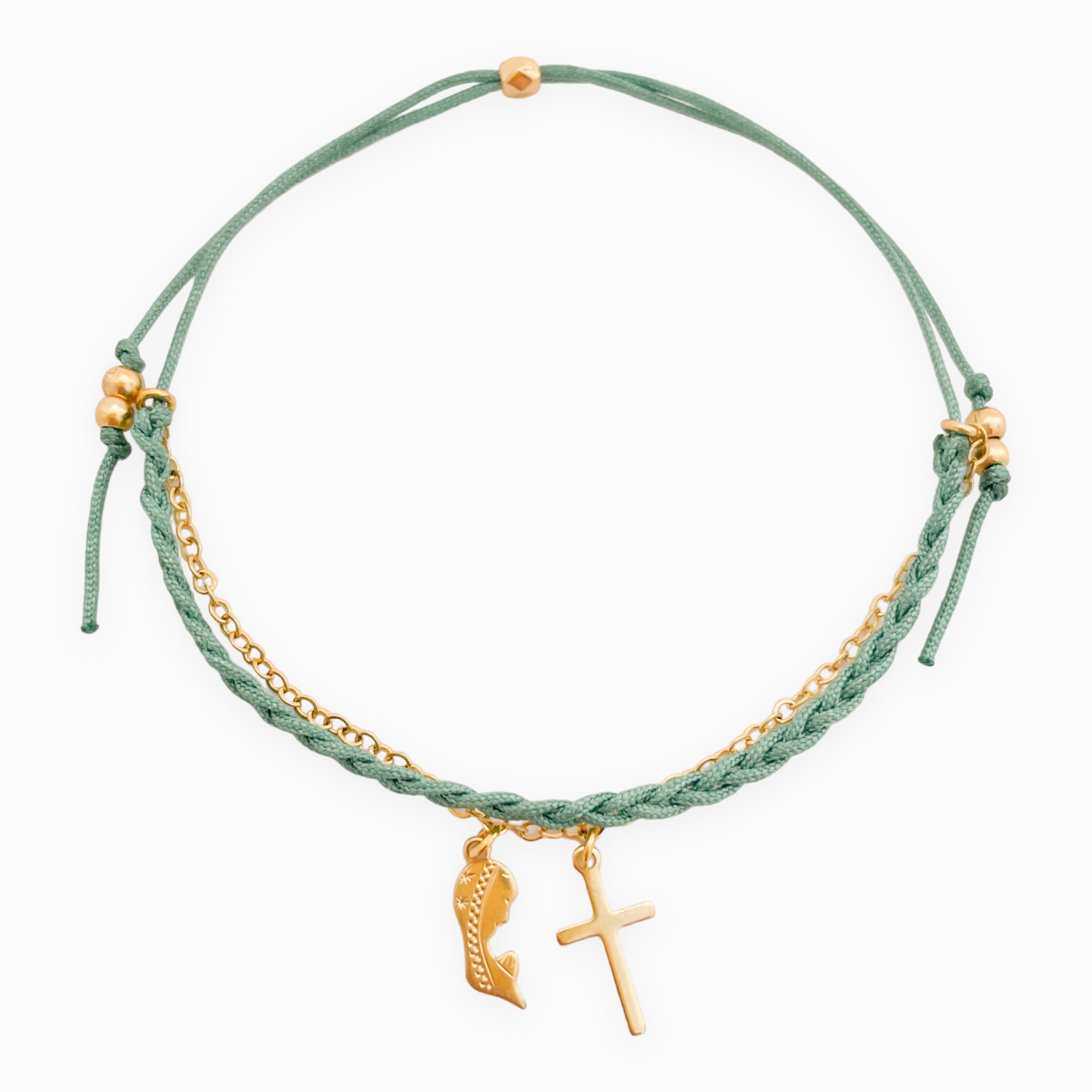 Pulsera fe virgencita cruz cadena trenza verde con significado ajustable, delicada y elaborada a mano. El dije de virgencita y cruz son símbolo de protección. Nuestras pulseras están llenas de significado y amor para inspirar y empoderar.