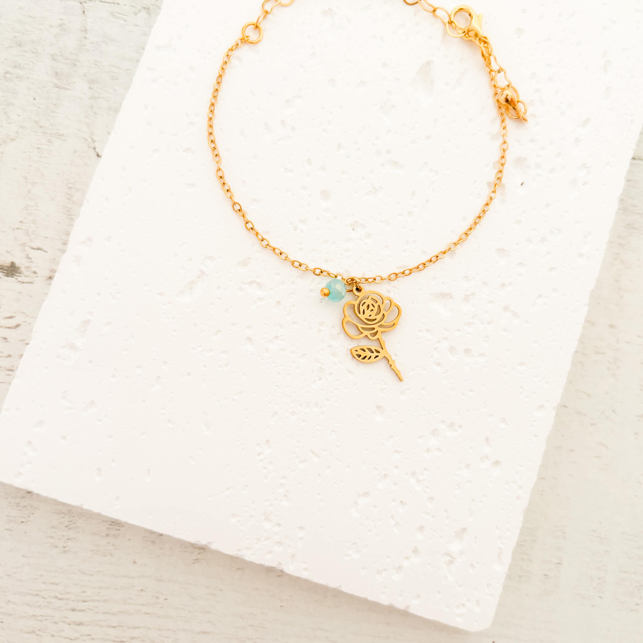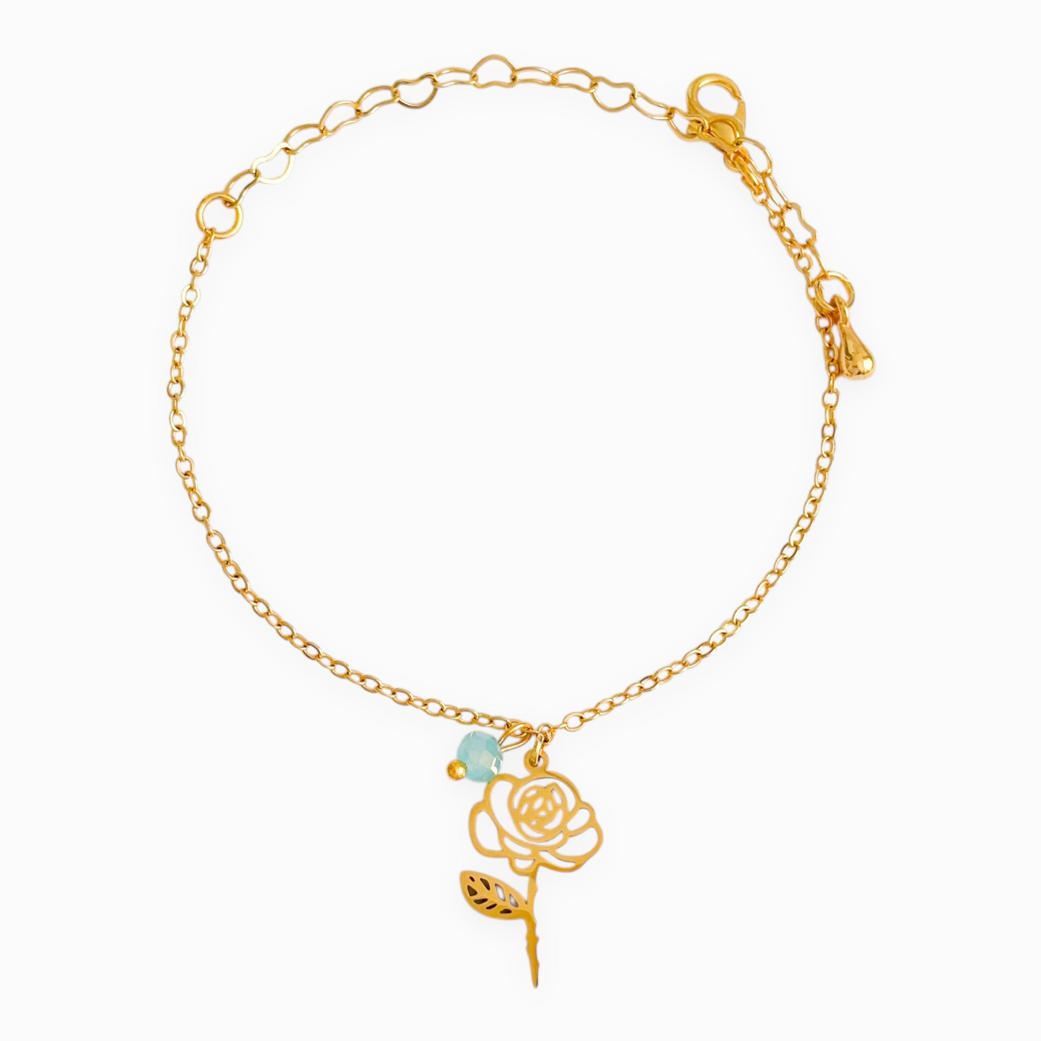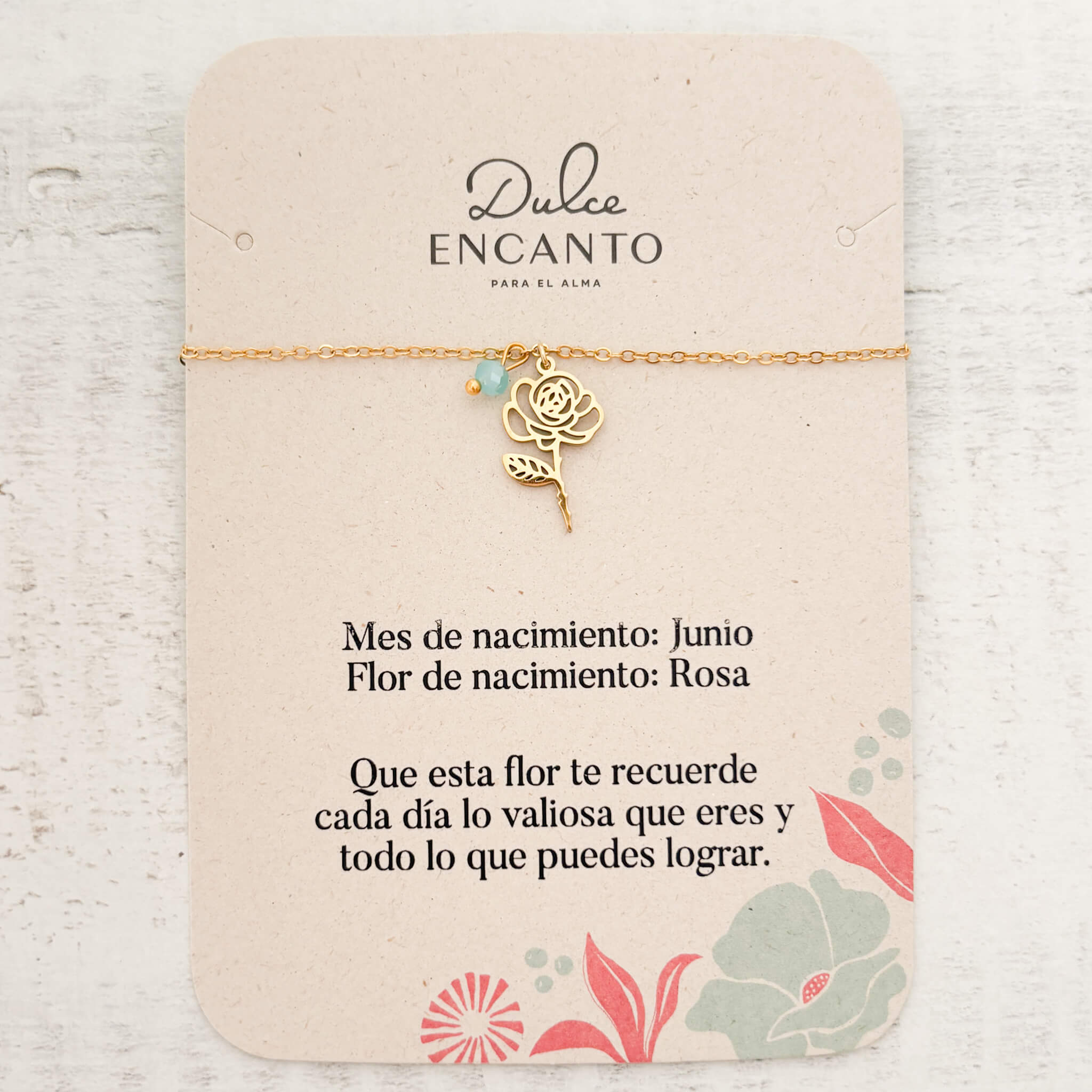 Pulsera flor de nacimiento rosa mes de junio con mensaje para mujer. El dije de flor de rosa es símbolo de amor y pasión. Representa la belleza y afecto profundo. Nuestras pulseras están llenas de significado y amor para inspirar y empoderar.