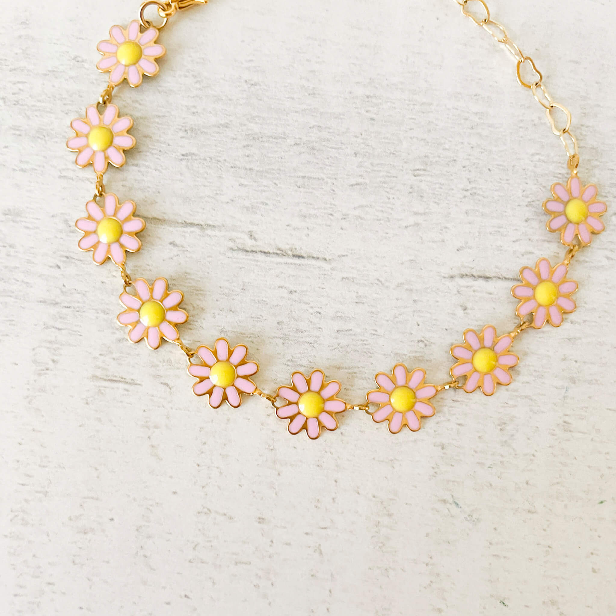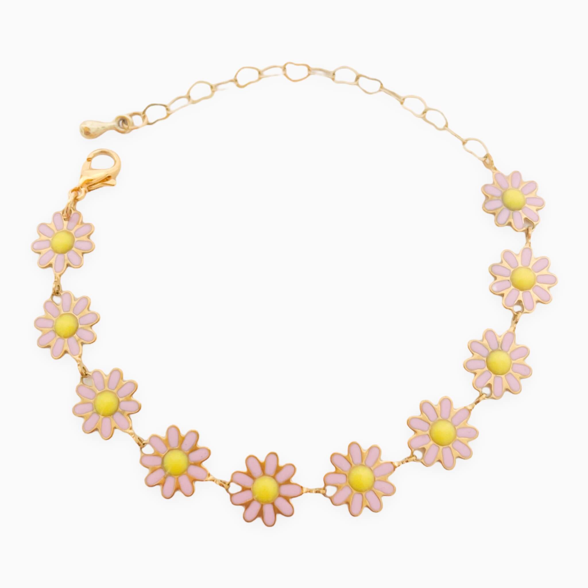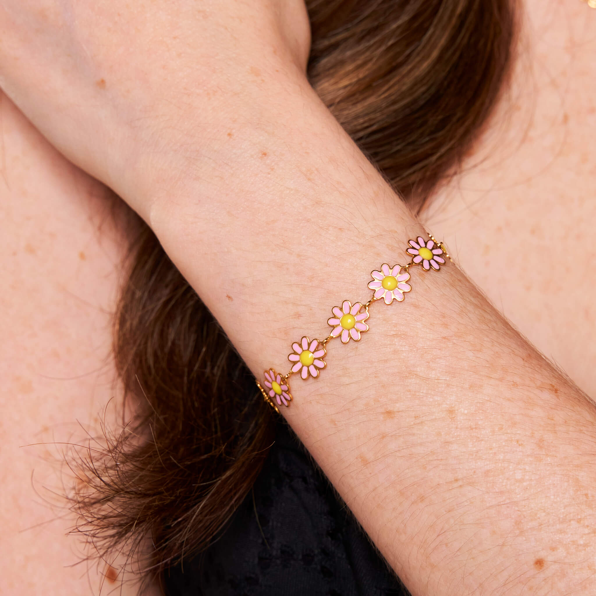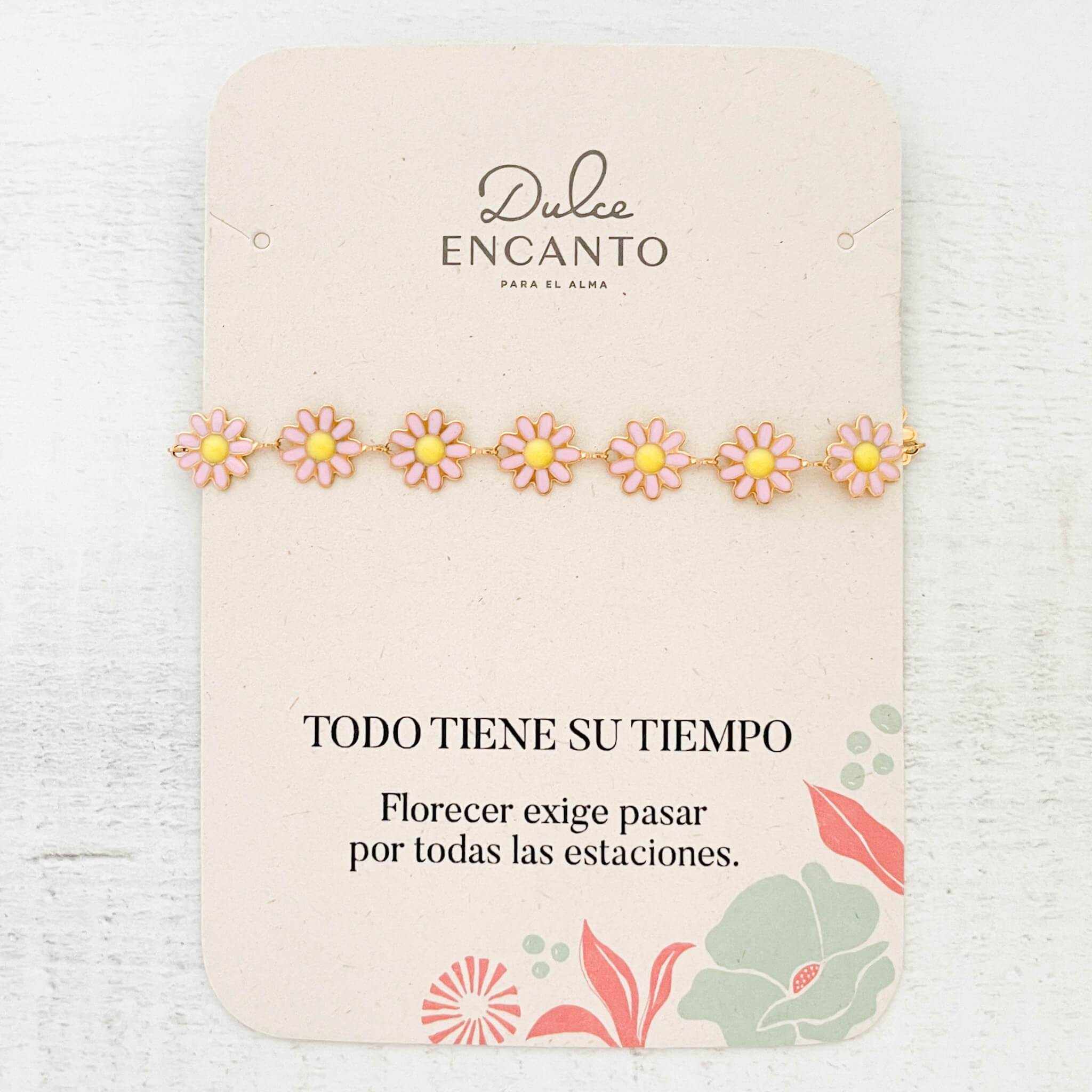 Pulsera flor margaritas rosadas con significado para mujer, delicada y femenina elaborada a mano. Los dijes de margaritas son símbolo renacer. Nuestras pulseras están llenas de significado, mensajes y buena energía para inspirar y empoderar!