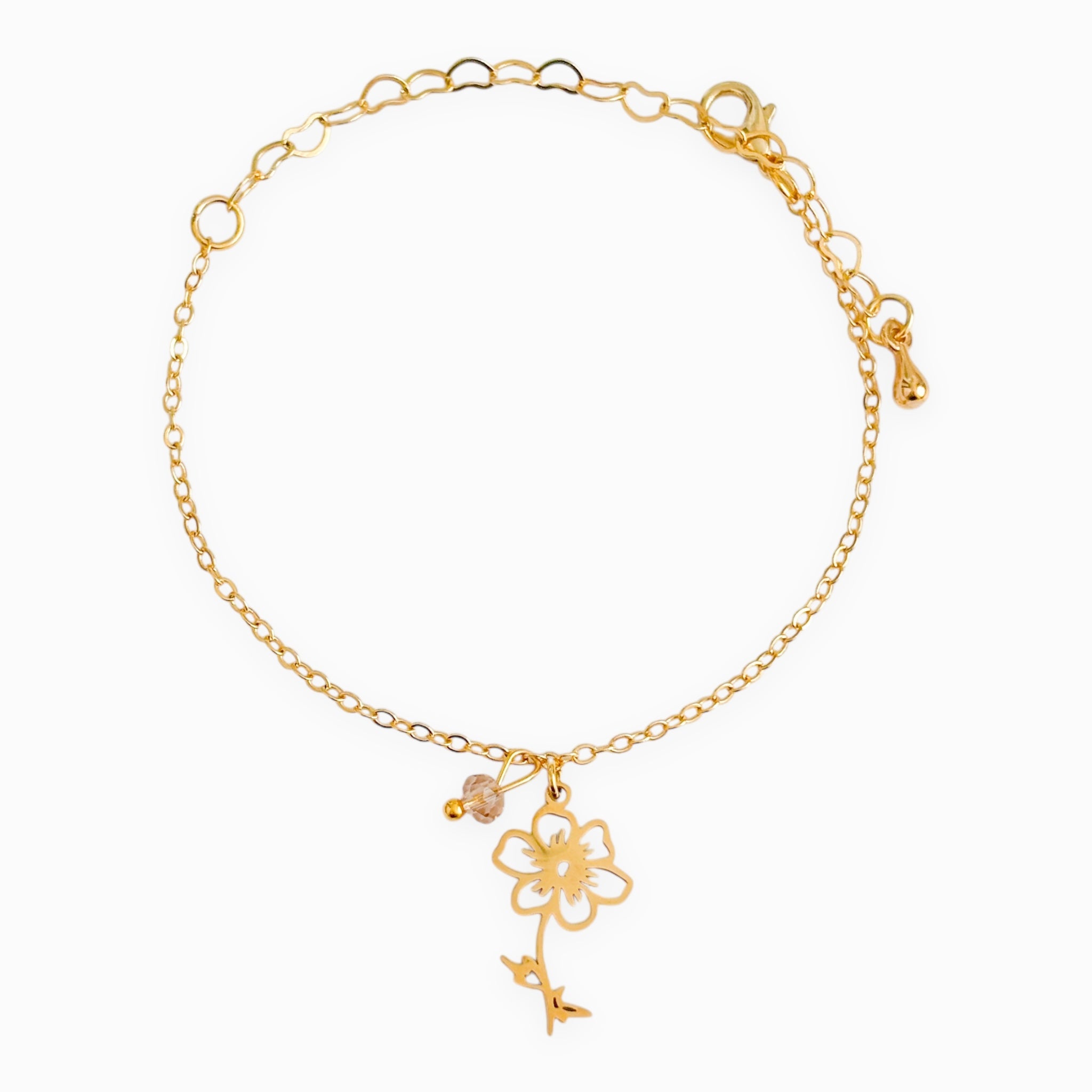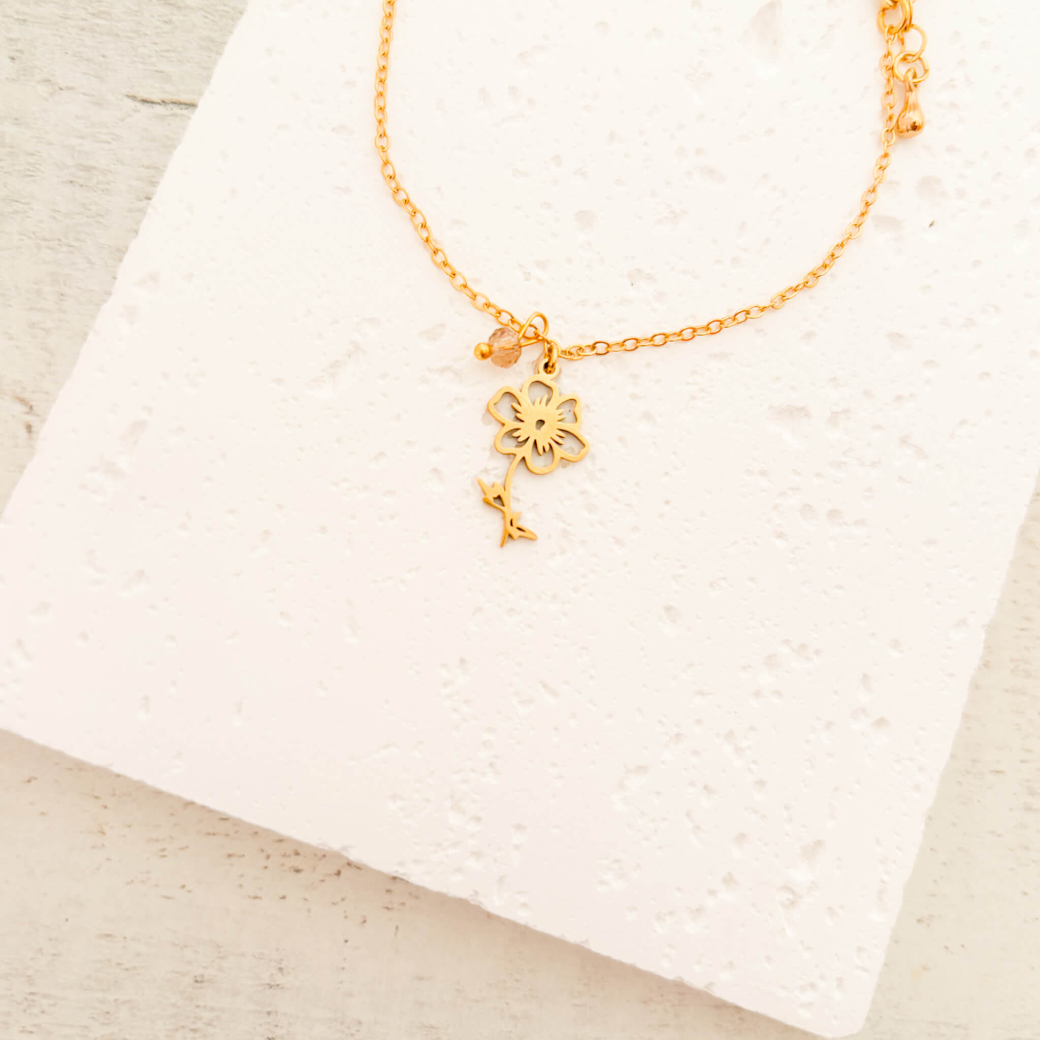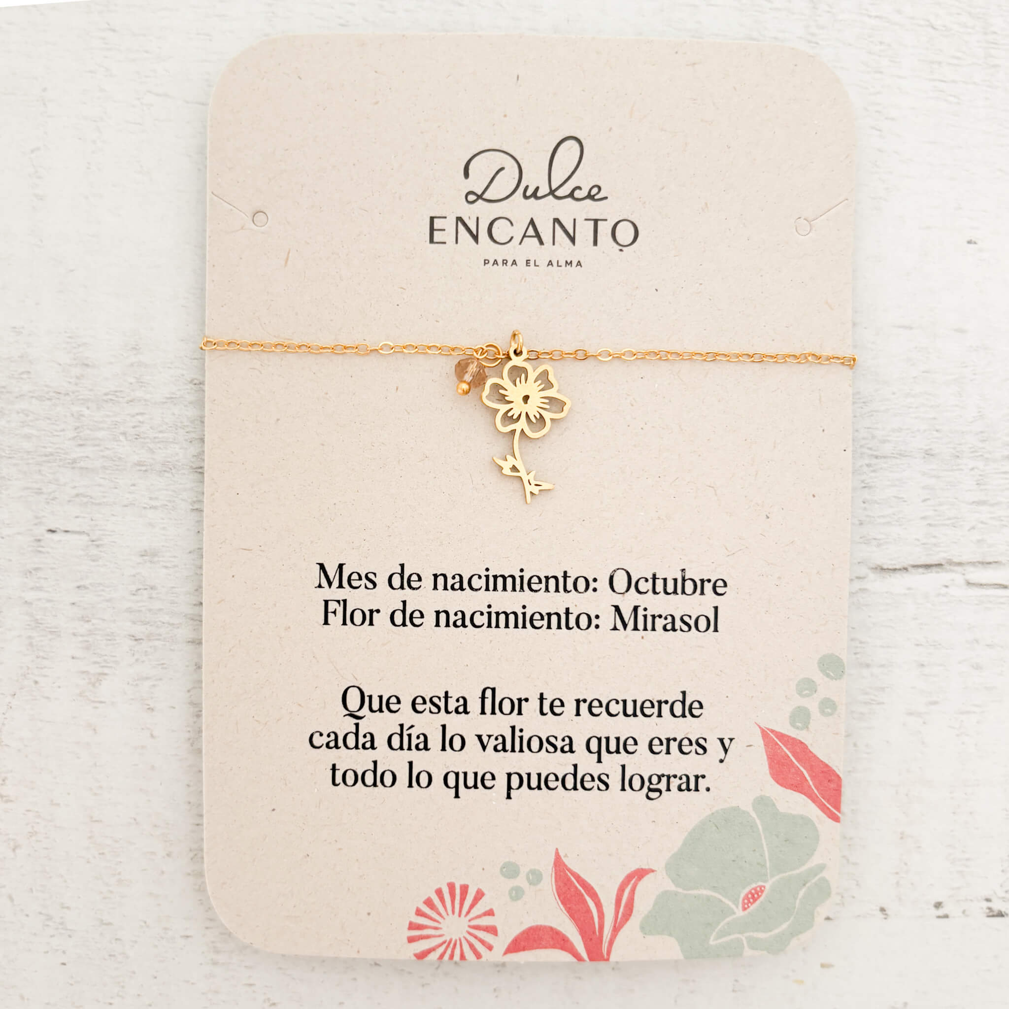 Pulsera flor de nacimiento mirasol mes de octubre con mensaje para mujer. El dije de flor mirasol es símbolo de lealtad. Evoca conexiones fuertes y duraderas. Nuestras pulseras están llenas de significado y amor para inspirar y empoderar.