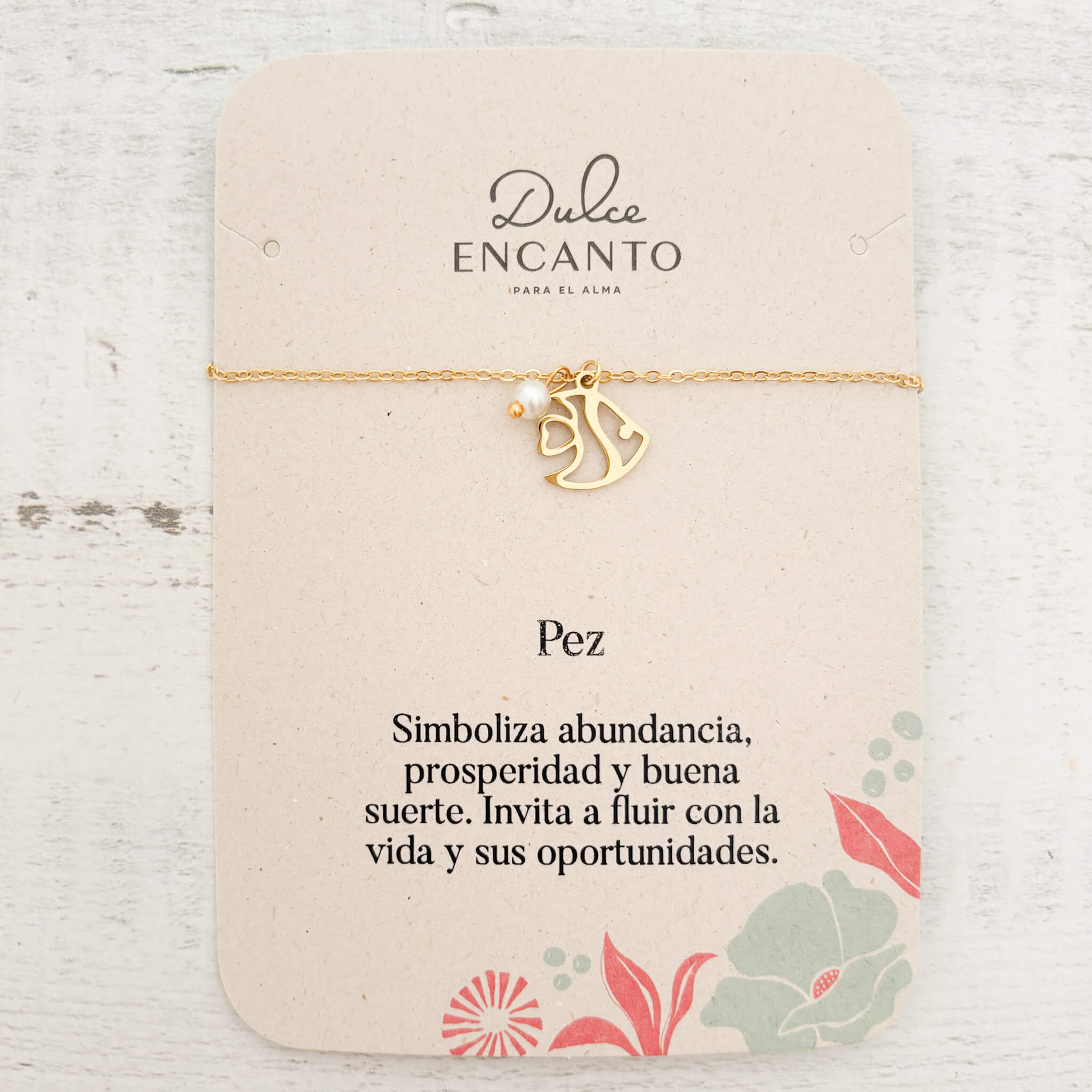 Pulsera pez con mensaje para mujer. El dije de pez simboliza abundancia, prosperidad y buena suerte. Invita a fluir con la vida y sus oportunidades. Nuestras pulseras están llenas de significado y amor para inspirar y empoderar.