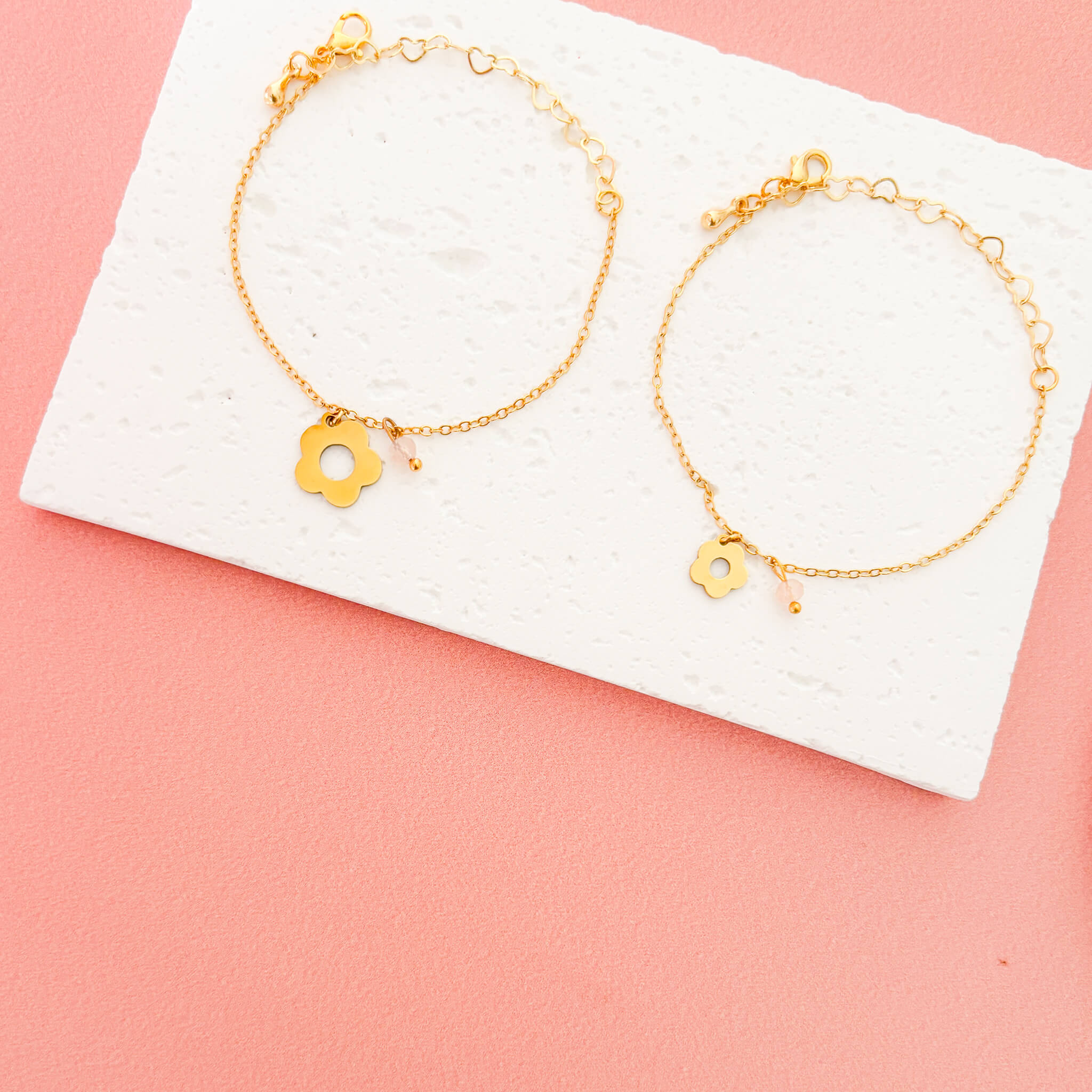 Celebra la ternura que crece con nuestras Pulseras Mamá e Hija Flores Muranos Rosado. Las flores representan belleza, crecimiento y amor en evolución; el murano rosado aporta dulzura y sensibilidad. Una joya para compartir y recordar que juntas siempre florecen más fuerte.