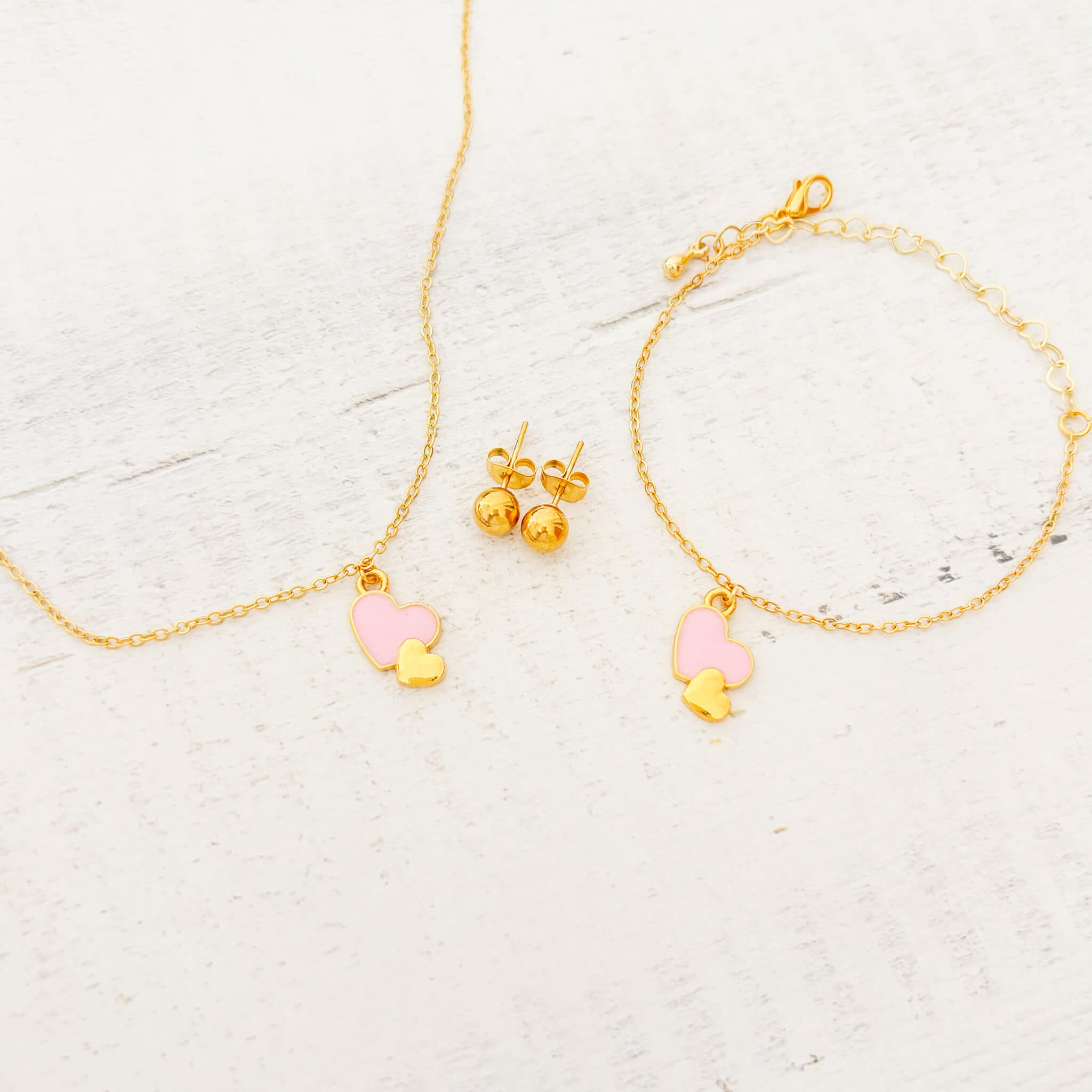 El set de cadena, pulsera y topos 2 Corazones Rosado-Dorado es una joya para celebrar el amor en su forma más dulce. Los corazones simbolizan conexión y ternura, mientras el tono rosado evoca amor propio, sensibilidad y vínculos sinceros. Una combinación delicada para recordarte que el amor empieza contigo y se refleja en todo lo que das.