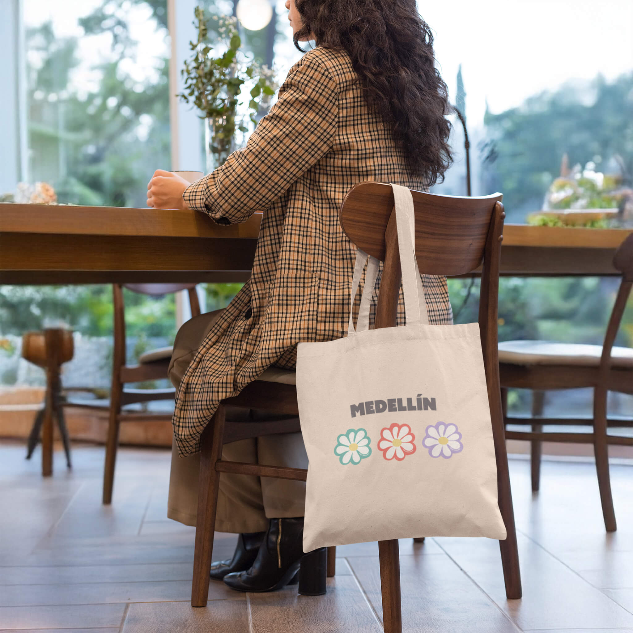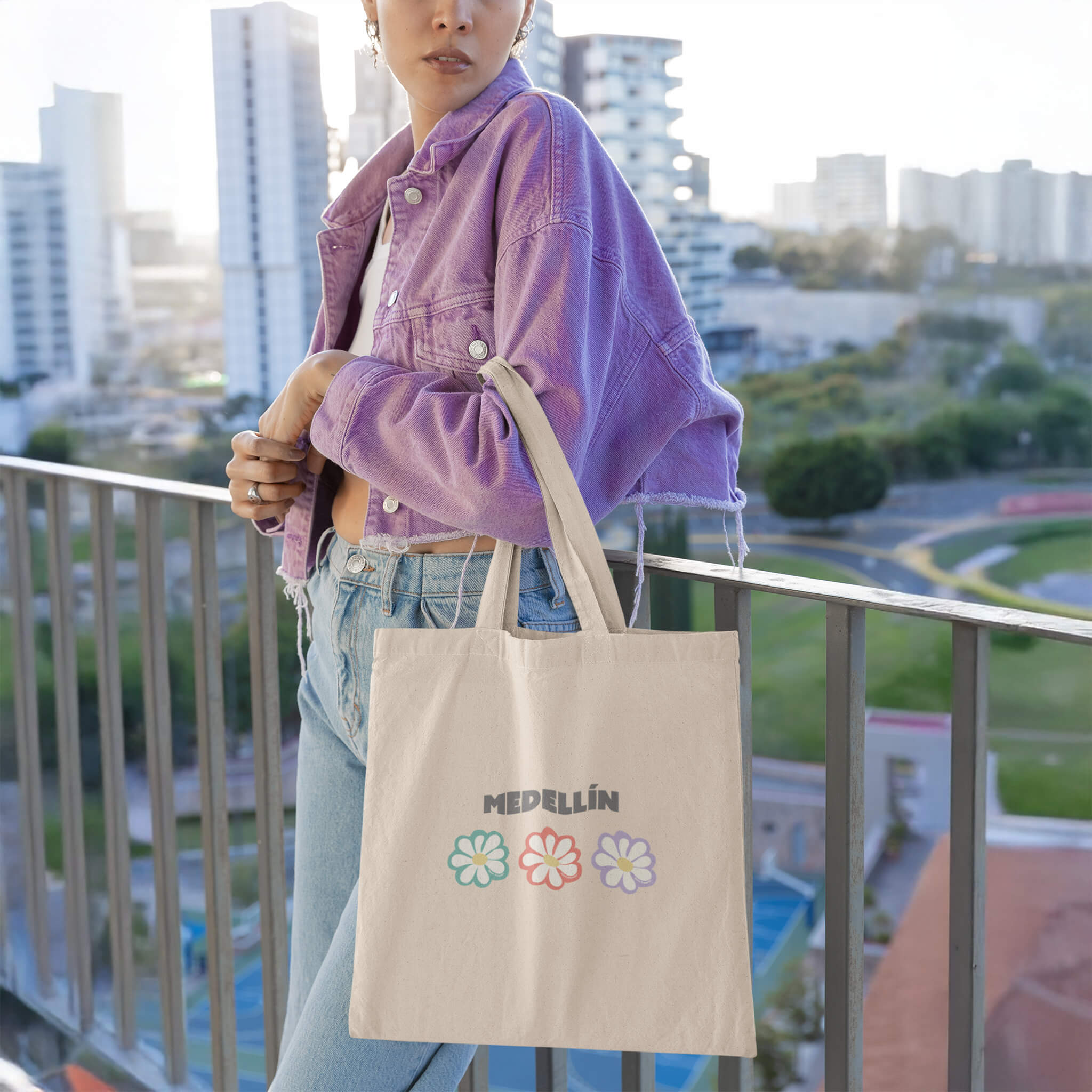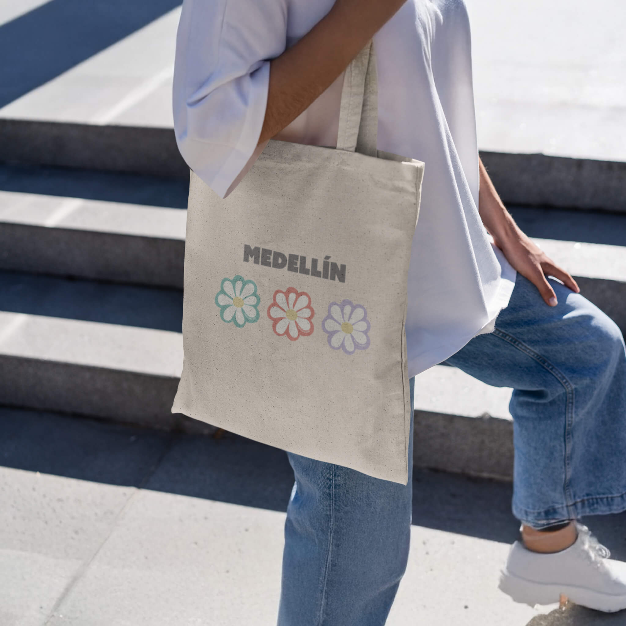 Bolsa estilo tote ecológica 3 flores, 3 deseos: inspirada en Medellín, ciudad de eterna primavera, donde cada flor representa un sueño, una intención, una esperanza. Llévala contigo como recordatorio de que florecer es posible en cualquier momento. Ayudemos a cuidar el planeta usando bolsas ecológicas y no de plástico. Nuestras ecobags están llenas de buena vibra para cambiar el mundo.